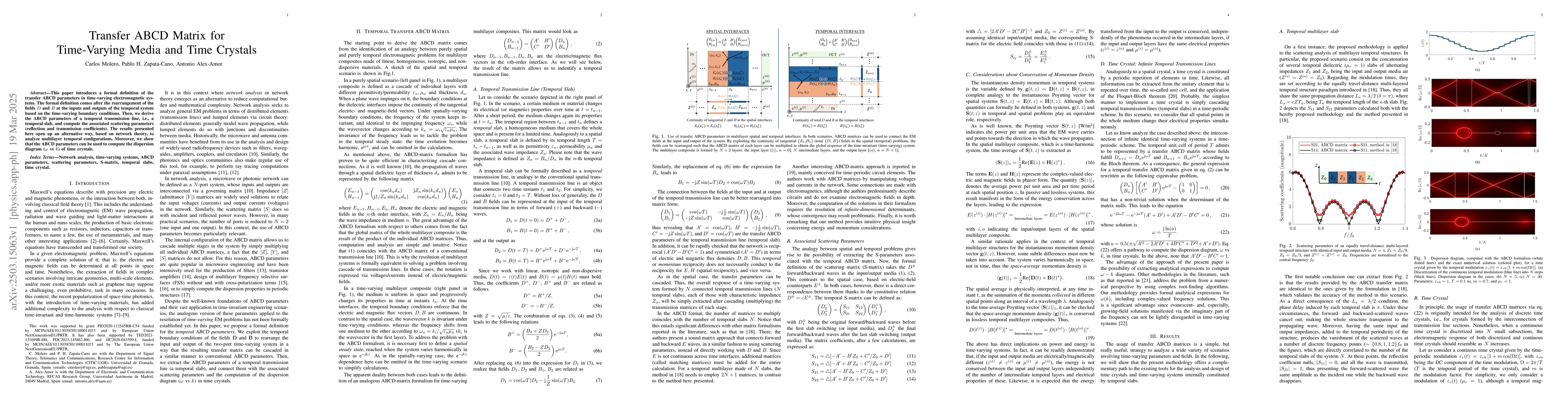 The paper presents a novel formalism for transfer ABCD parameters in time-varying media, enabling the analysis of temporal transmission lines and time crystals through network theory, with analytic expressions for dispersion diagrams.