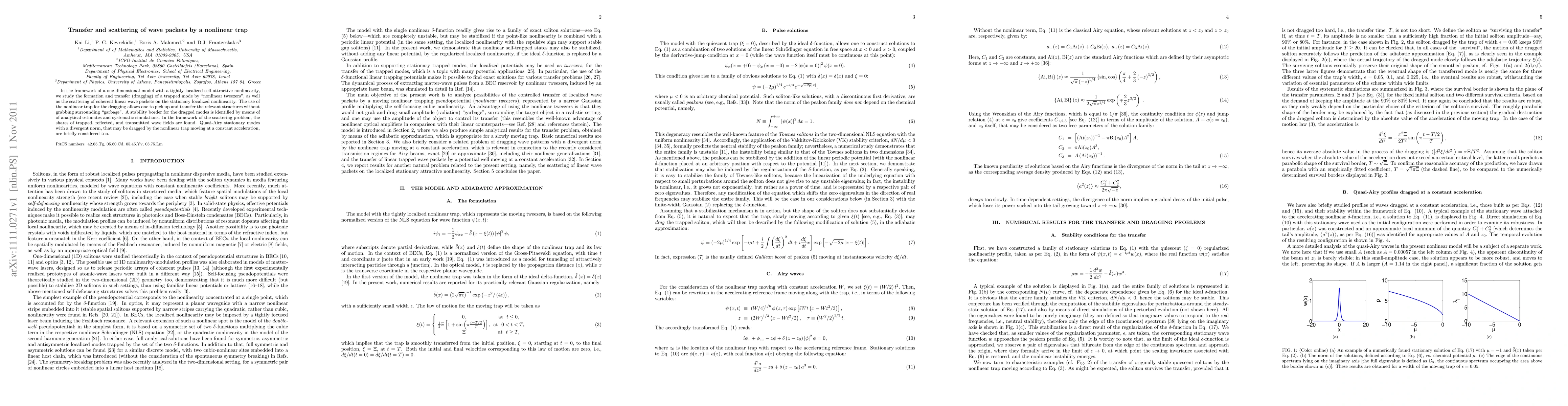 In the framework of a one-dimensional model with a tightly localized self-attractive nonlinearity, we study the formation and transfer (dragging) of a trapped mode by "nonlinear tweezers", as well as the scattering of coherent linear wave packets on the stationary localized nonlinearity. The use of the nonlinear trap for the dragging allows one to pick up and transfer the relevant structures without grabbing surrounding "garbage". A stability border for the dragged modes is identified by means of of analytical estimates and systematic simulations. In the framework of the scattering problem, the shares of trapped, reflected, and transmitted wave fields are found. Quasi-Airy stationary modes with a divergent norm, that may be dragged by the nonlinear trap moving at a constant acceleration, are briefly considered too.
