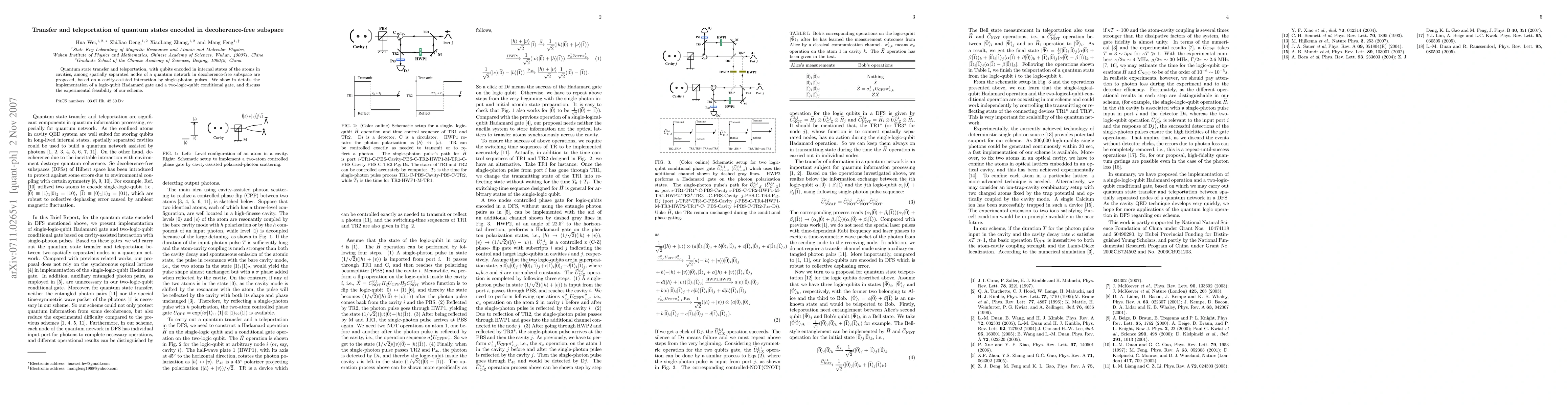 This paper proposes a method for quantum state transfer and teleportation using qubits encoded in decoherence-free subspaces, facilitated by cavity-assisted interactions via single-photon pulses. It details the implementation of a Hadamard gate and a two-qubit conditional gate, and assesses the experimental feasibility of the proposed scheme.