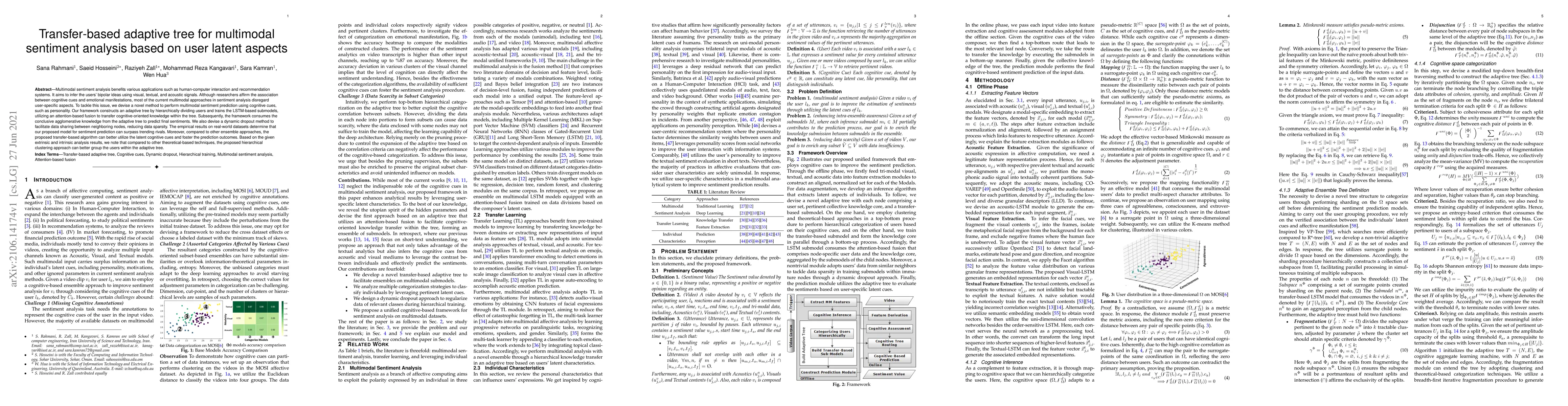 Multimodal sentiment analysis benefits various applications such as human-computer interaction and recommendation systems. It aims to infer the users' bipolar ideas using visual, textual, and acoustic signals. Although researchers affirm the association between cognitive cues and emotional manifestations, most of the current multimodal approaches in sentiment analysis disregard user-specific aspects. To tackle this issue, we devise a novel method to perform multimodal sentiment prediction using cognitive cues, such as personality. Our framework constructs an adaptive tree by hierarchically dividing users and trains the LSTM-based submodels, utilizing an attention-based fusion to transfer cognitive-oriented knowledge within the tree. Subsequently, the framework consumes the conclusive agglomerative knowledge from the adaptive tree to predict final sentiments. We also devise a dynamic dropout method to facilitate data sharing between neighboring nodes, reducing data sparsity. The empirical results on real-world datasets determine that our proposed model for sentiment prediction can surpass trending rivals. Moreover, compared to other ensemble approaches, the proposed transfer-based algorithm can better utilize the latent cognitive cues and foster the prediction outcomes. Based on the given extrinsic and intrinsic analysis results, we note that compared to other theoretical-based techniques, the proposed hierarchical clustering approach can better group the users within the adaptive tree.