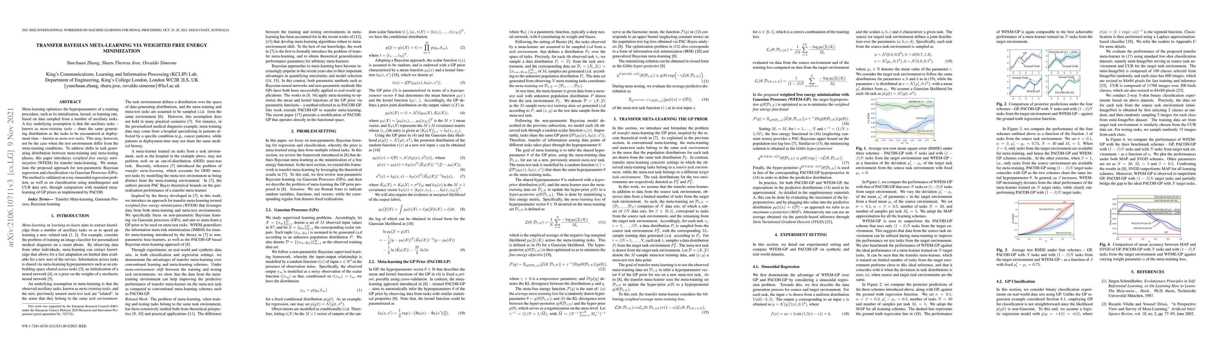 This paper proposes weighted free energy minimization (WFEM) for transfer Bayesian meta-learning to address shifts in task distributions between training and testing phases. The method is demonstrated through non-parametric Bayesian regression and classification using Gaussian Processes, validated on various datasets.