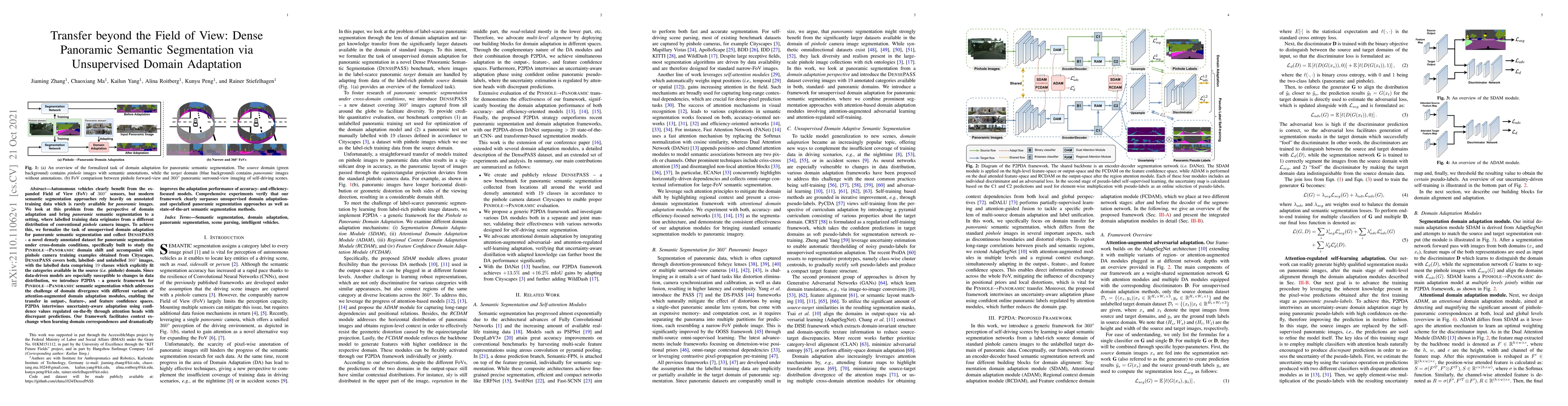 This paper proposes P2PDA, a framework for unsupervised domain adaptation to enable dense panoramic semantic segmentation from pinhole camera data. The authors introduce DensePASS, a new dataset for studying the domain shift from pinhole to panoramic images, and demonstrate that P2PDA significantly outperforms existing methods by addressing domain divergence through attention-augmented domain adaptation modules.