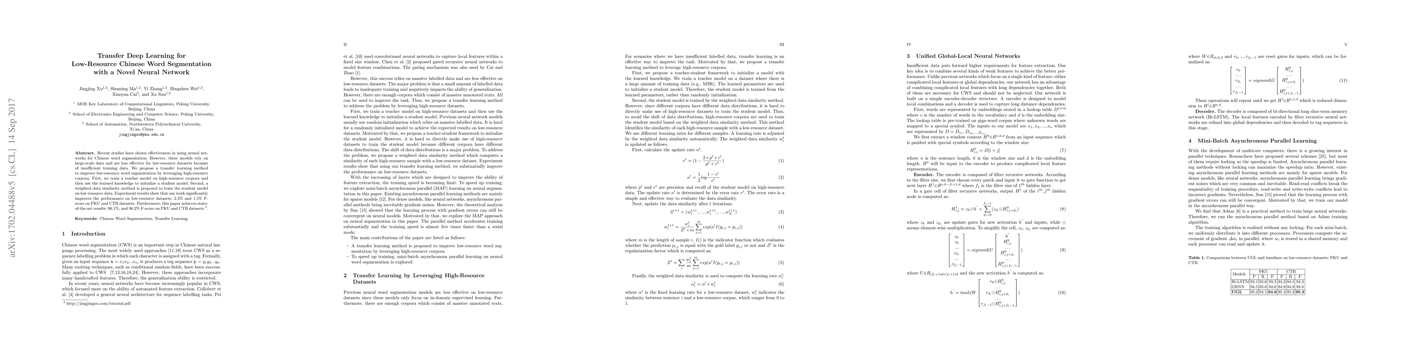 This paper proposes a transfer learning method to enhance Chinese word segmentation in low-resource settings by leveraging high-resource corpora. The approach trains a teacher model on abundant data and initializes a student model, which is then fine-tuned using a weighted data similarity method on limited data, achieving state-of-the-art results with notable improvements on PKU and CTB datasets.