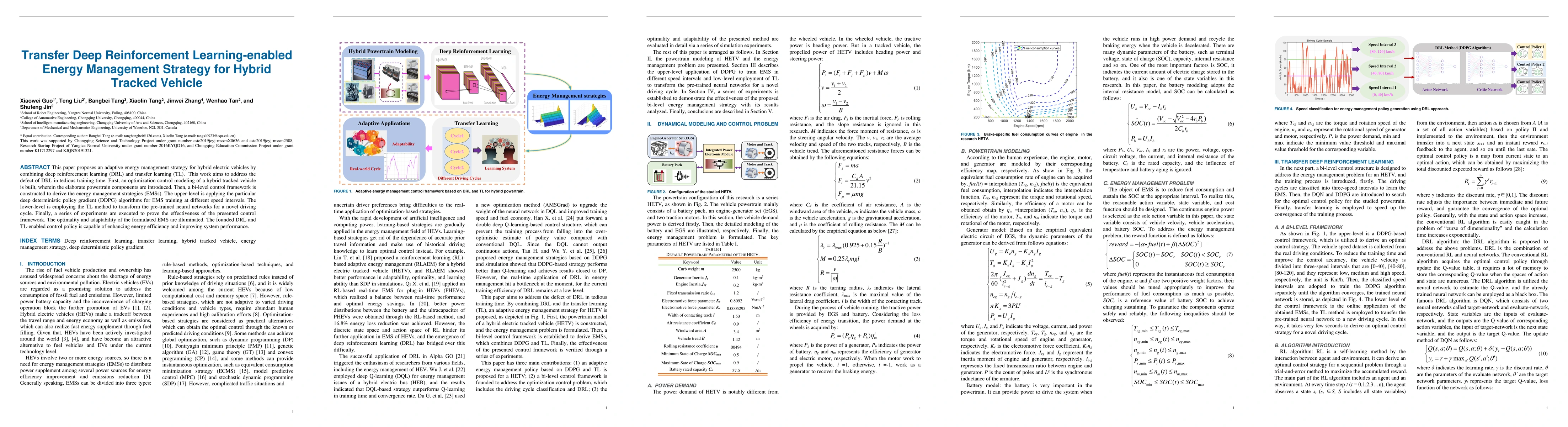 This paper proposes an adaptive energy management strategy for hybrid electric vehicles by combining deep reinforcement learning (DRL) and transfer learning (TL). This work aims to address the defect of DRL in tedious training time. First, an optimization control modeling of a hybrid tracked vehicle is built, wherein the elaborate powertrain components are introduced. Then, a bi-level control framework is constructed to derive the energy management strategies (EMSs). The upper-level is applying the particular deep deterministic policy gradient (DDPG) algorithms for EMS training at different speed intervals. The lower-level is employing the TL method to transform the pre-trained neural networks for a novel driving cycle. Finally, a series of experiments are executed to prove the effectiveness of the presented control framework. The optimality and adaptability of the formulated EMS are illuminated. The founded DRL and TL-enabled control policy is capable of enhancing energy efficiency and improving system performance.