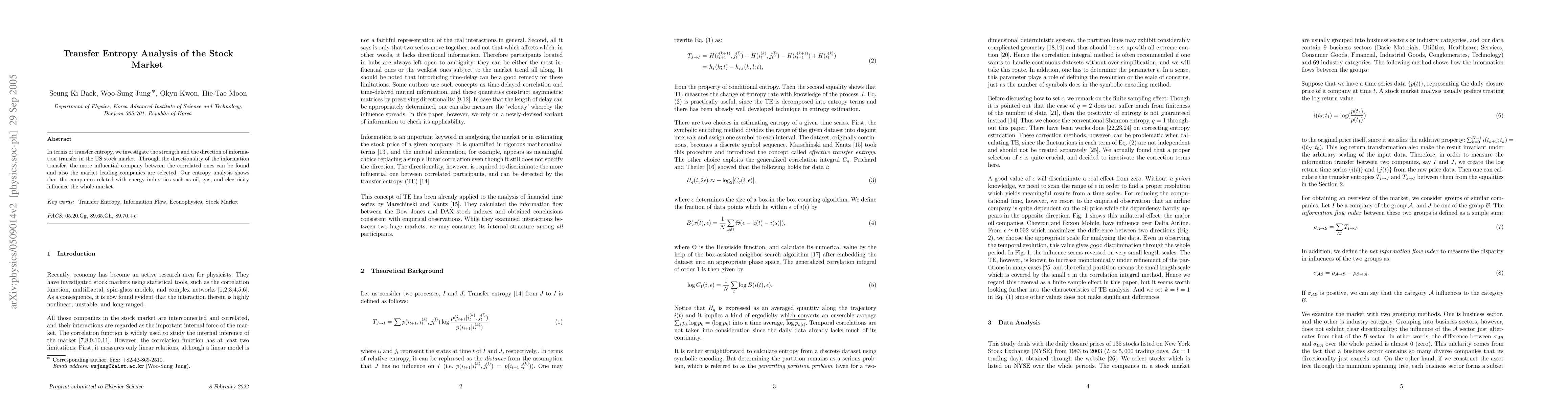 Summary: This study uses transfer entropy to analyze information flow in the US stock market, identifying influential companies and market leaders. The analysis reveals that energy sector companies, particularly those involved in oil, gas, and electricity, have a significant impact on the overall market.