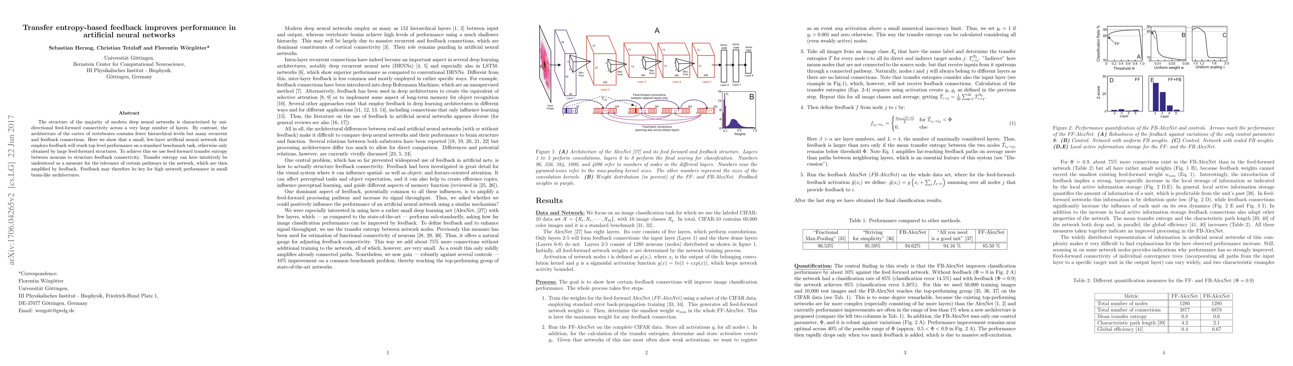 A small artificial neural network with feedback connectivity outperforms large feed-forward networks on a standard benchmark task. Transfer entropy-based feedback improves performance in artificial neural networks.