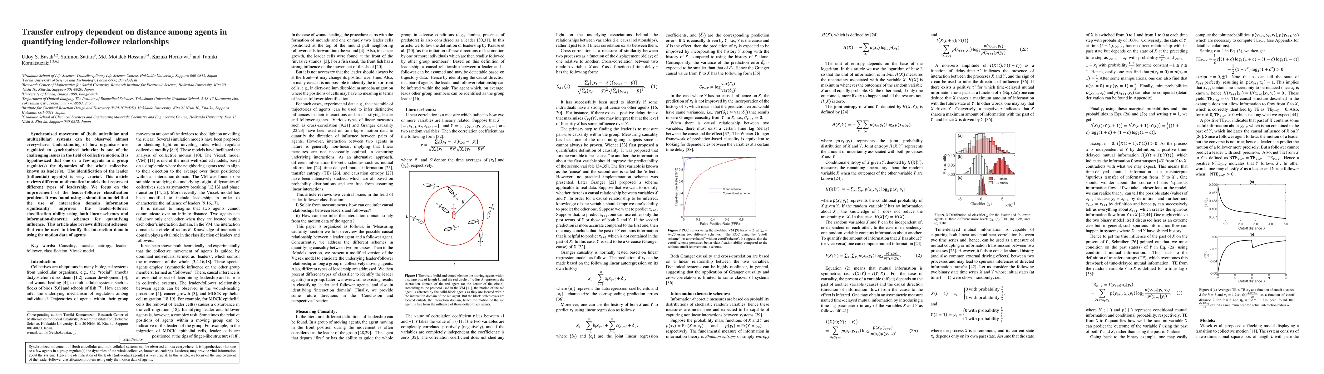This paper explores the use of transfer entropy to improve leader-follower classification in collective motion systems, emphasizing the significance of distance among agents. It reviews mathematical models for leadership and highlights the enhanced classification ability through interaction domain information.