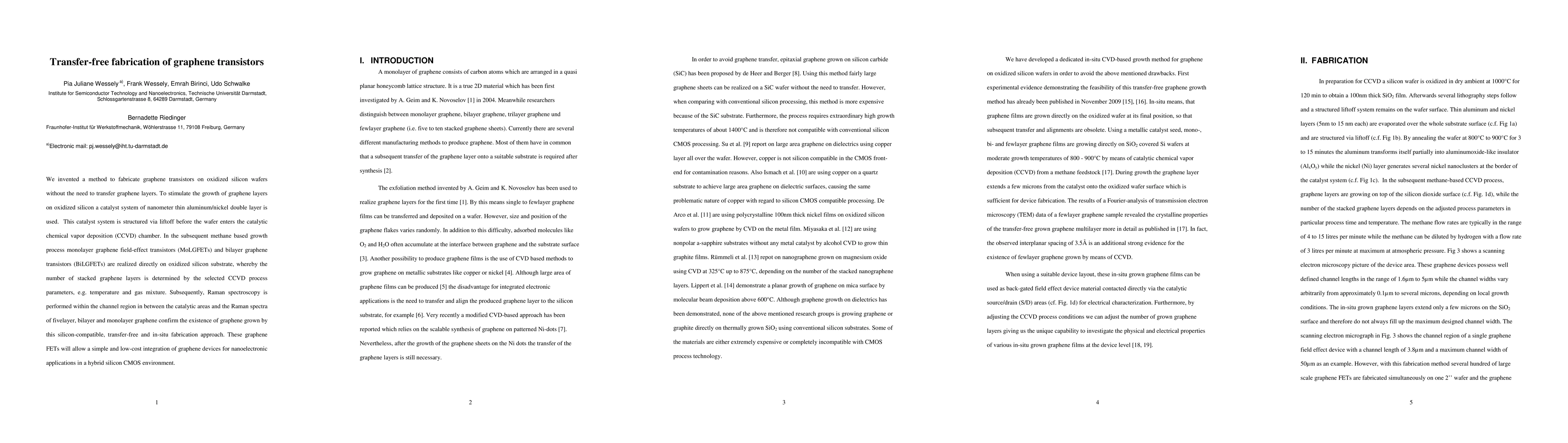 We invented a method to fabricate graphene transistors on oxidized silicon wafers without the need to transfer graphene layers. To stimulate the growth of graphene layers on oxidized silicon a catalyst system of nanometer thin aluminum/nickel double layer is used. This catalyst system is structured via liftoff before the wafer enters the catalytic chemical vapor deposition (CCVD) chamber. In the subsequent methane based growth process monolayer graphene field-effect transistors (MoLGFETs) and bilayer graphene transistors (BiLGFETs) are realized directly on oxidized silicon substrate, whereby the number of stacked graphene layers is determined by the selected CCVD process parameters, e.g. temperature and gas mixture. Subsequently, Raman spectroscopy is performed within the channel region in between the catalytic areas and the Raman spectra of fivelayer, bilayer and monolayer graphene confirm the existence of graphene grown by this silicon-compatible, transfer-free and in-situ fabrication approach. These graphene FETs will allow a simple and low-cost integration of graphene devices for nanoelectronic applications in a hybrid silicon CMOS environment.