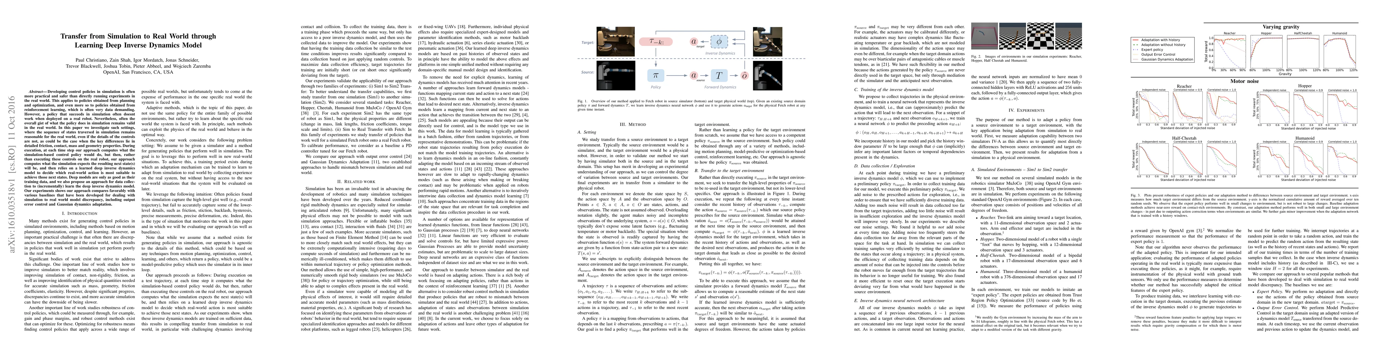 This paper proposes a method to transfer control policies from simulation to real-world robots by using a learned deep inverse dynamics model to bridge the gap between simulated and real-world actions, addressing discrepancies in friction, contact, mass, and geometry. The approach collects data incrementally to refine the model and demonstrates better performance compared to baseline methods.