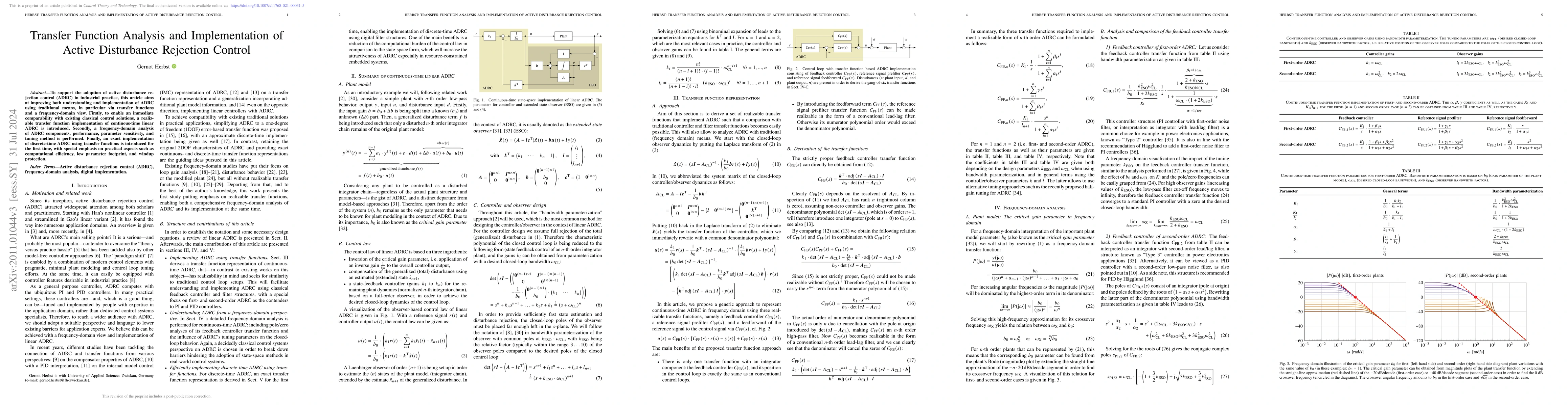 The paper introduces a transfer function analysis and implementation of Active Disturbance Rejection Control (ADRC) using traditional means, focusing on comparability with classical control solutions through frequency-domain views.