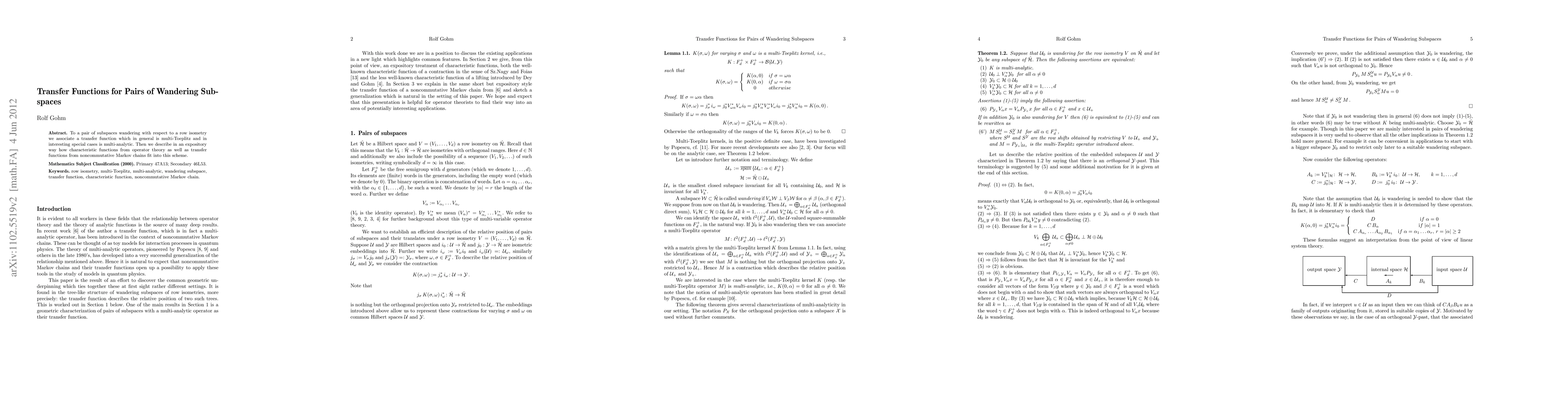 This research associates transfer functions with pairs of subspaces that 'wandering' under a row isometry, often multi-Toeplitz and sometimes multi-analytic. It also connects these functions to characteristic functions from operator theory and noncommutative Markov chains.