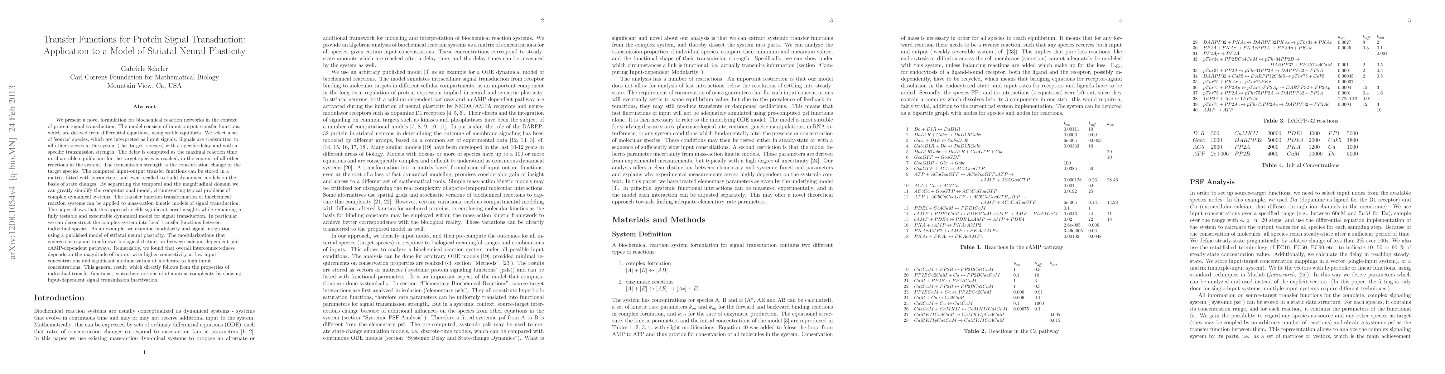 We present a novel formulation for biochemical reaction networks in the context of signal transduction. The model consists of input-output transfer functions, which are derived from differential equations, using stable equilibria. We select a set of 'source' species, which receive input signals. Signals are transmitted to all other species in the system (the 'target' species) with a specific delay and transmission strength. The delay is computed as the maximal reaction time until a stable equilibrium for the target species is reached, in the context of all other reactions in the system. The transmission strength is the concentration change of the target species. The computed input-output transfer functions can be stored in a matrix, fitted with parameters, and recalled to build discrete dynamical models. By separating reaction time and concentration we can greatly simplify the model, circumventing typical problems of complex dynamical systems. The transfer function transformation can be applied to mass-action kinetic models of signal transduction. The paper shows that this approach yields significant insight, while remaining an executable dynamical model for signal transduction. In particular we can deconstruct the complex system into local transfer functions between individual species. As an example, we examine modularity and signal integration using a published model of striatal neural plasticity. The modules that emerge correspond to a known biological distinction between calcium-dependent and cAMP-dependent pathways. We also found that overall interconnectedness depends on the magnitude of input, with high connectivity at low input and less connectivity at moderate to high input. This general result, which directly follows from the properties of individual transfer functions, contradicts notions of ubiquitous complexity by showing input-dependent signal transmission inactivation.