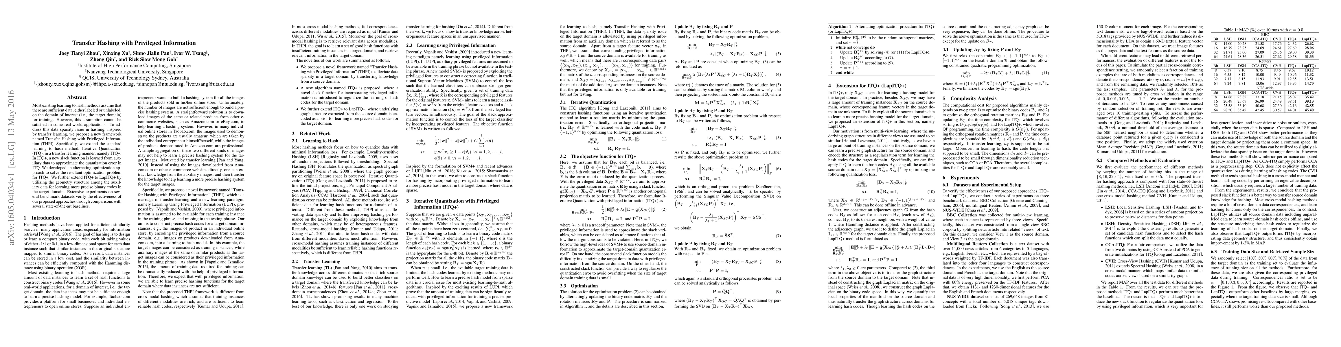 The paper proposes Transfer Hashing with Privileged Information (THPI) to address data sparsity in hashing by leveraging auxiliary data through a transfer learning approach. The method, ITQ+, extends Iterative Quantization with a new slack function, and LapITQ+ further utilizes geometry among auxiliary data for precise binary codes, showing effectiveness in experiments.