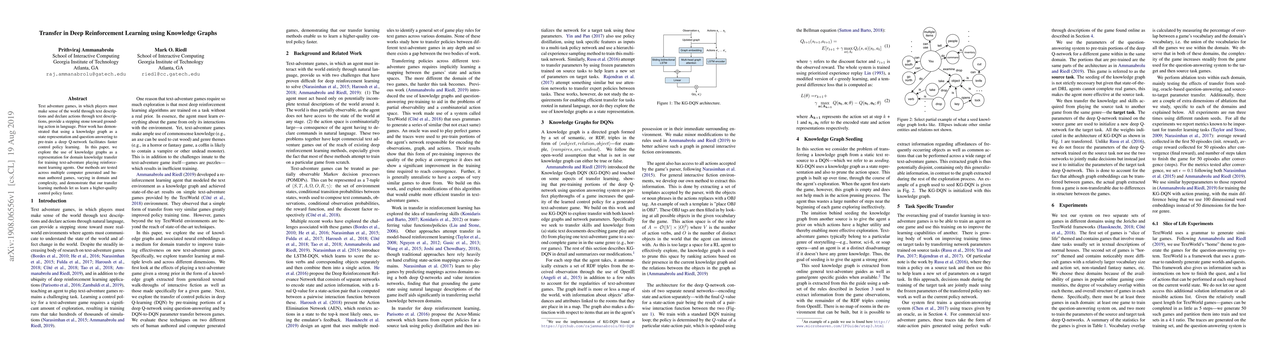 This paper investigates leveraging knowledge graphs for domain knowledge transfer in deep reinforcement learning, specifically for training text-adventure playing agents. The proposed methods, tested across diverse games, show faster learning and higher-quality control policies compared to traditional approaches.