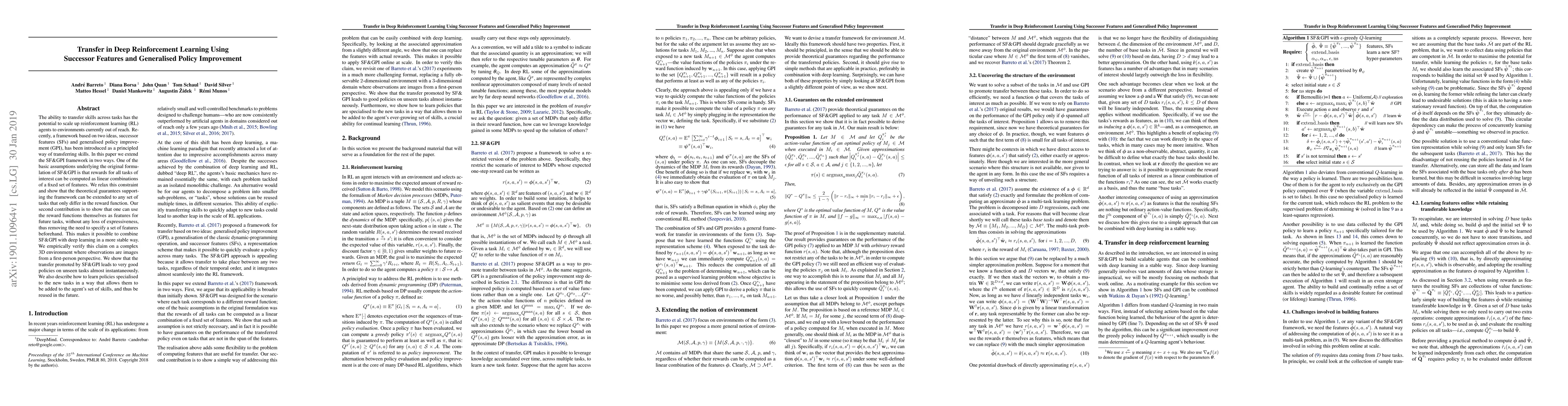 This paper extends the framework of successor features and generalised policy improvement for deep reinforcement learning, allowing transfer across tasks with different reward functions. It demonstrates that reward functions can serve as features, enhancing the integration with deep learning and achieving effective skill transfer in a complex 3D environment.