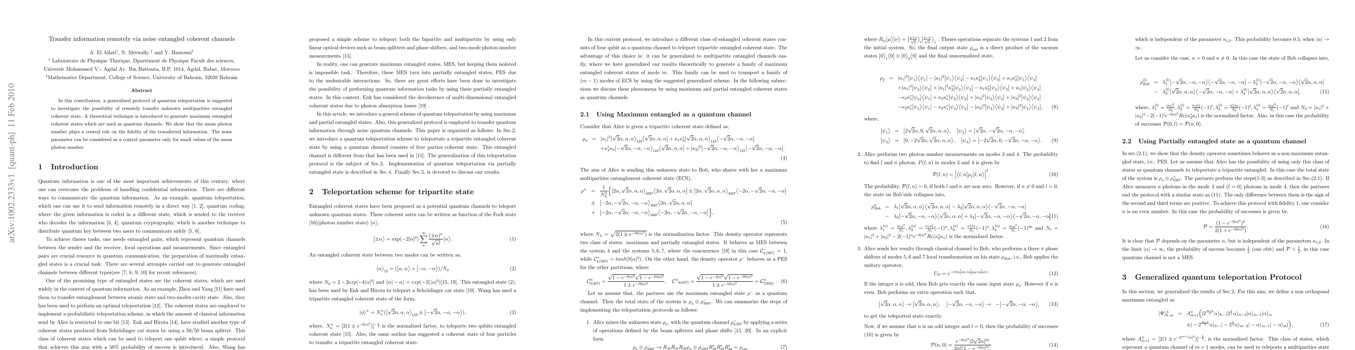 In this contribution, a generalized protocol of quantum teleportation is suggested to investigate the possibility of remotely transfer unknown multiparities entangled coherent state. A theoretical technique is introduced to generate maximum entangled coherent states which are used as quantum channels. We show that the mean photon number plays a central role on the fidelity of the transferred information. The noise parameter can be considered as a control parameter only for small values of the mean photon number.