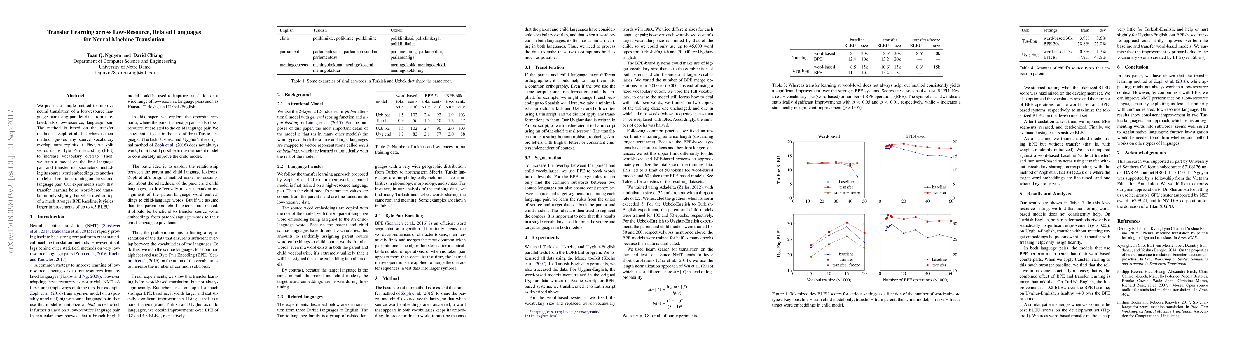 Researchers developed a method to improve neural machine translation for low-resource languages using transfer learning from related languages. Their approach achieved up to 4.3 BLEU score improvements when combined with Byte Pair Encoding.