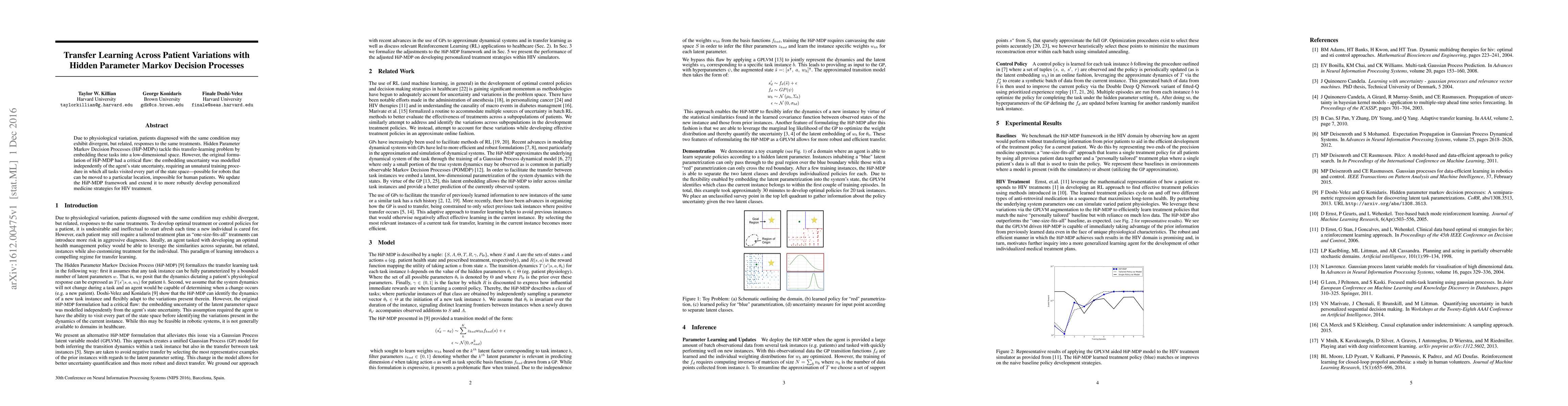 Due to physiological variation, patients diagnosed with the same condition may exhibit divergent, but related, responses to the same treatments. Hidden Parameter Markov Decision Processes (HiP-MDPs) tackle this transfer-learning problem by embedding these tasks into a low-dimensional space. However, the original formulation of HiP-MDP had a critical flaw: the embedding uncertainty was modeled independently of the agent's state uncertainty, requiring an unnatural training procedure in which all tasks visited every part of the state space---possible for robots that can be moved to a particular location, impossible for human patients. We update the HiP-MDP framework and extend it to more robustly develop personalized medicine strategies for HIV treatment.