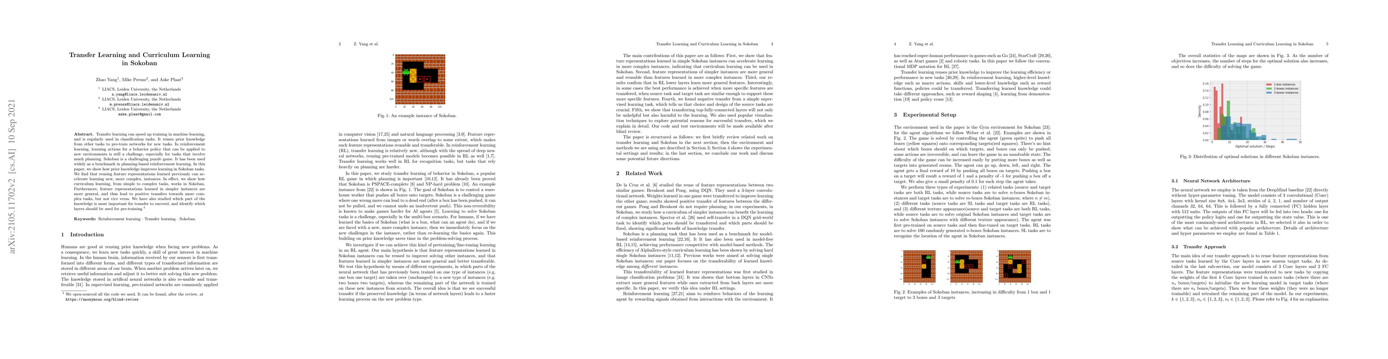 This paper explores the application of transfer learning in Sokoban, demonstrating that prior knowledge from simpler tasks accelerates learning in more complex instances. It finds that curriculum learning, starting from simple to complex tasks, enhances performance, with feature representations from simpler tasks being more general and beneficial for transfer.