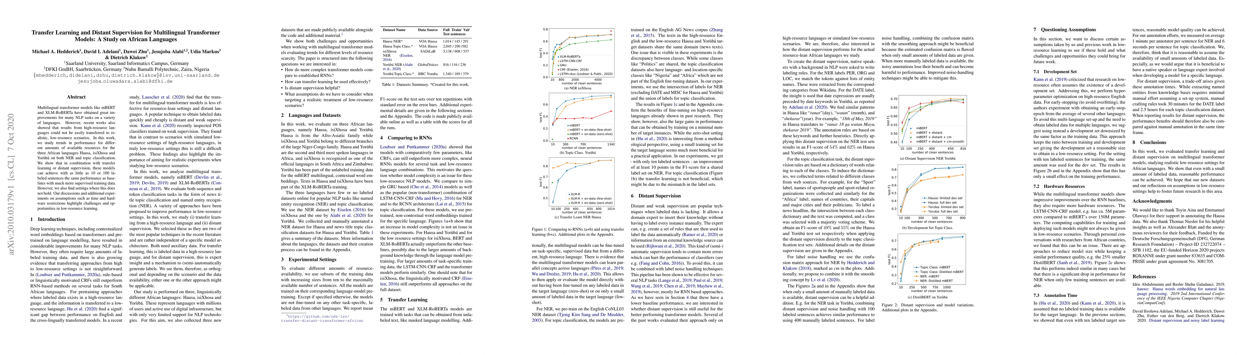 This study investigates the performance of multilingual transformer models on African languages (Hausa, isiXhosa, and Yoruba) using transfer learning and distant supervision. It finds that even with minimal labeled data (10-100 sentences), these models can achieve comparable results to those trained with larger datasets, though challenges remain under resource constraints.