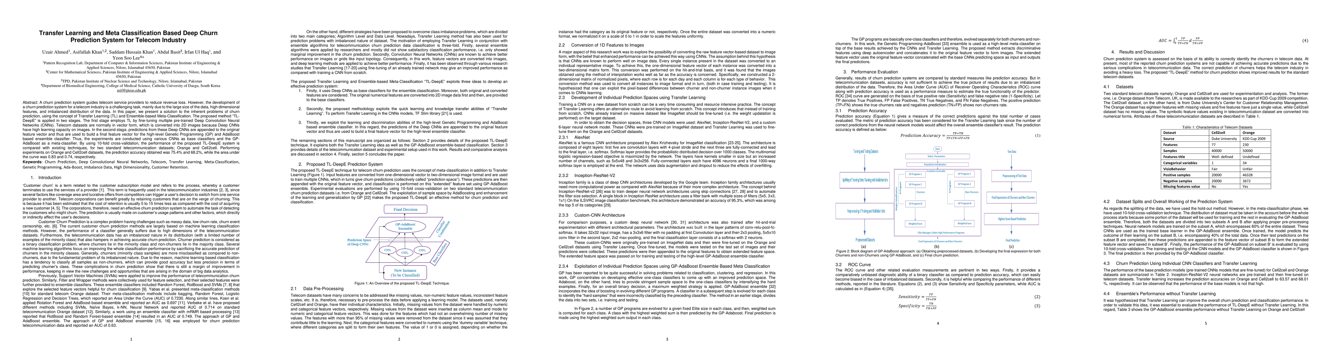 This paper proposes a Transfer Learning and Ensemble-based Meta-Classification system, TL-DeepE, for predicting churn in telecom services. The method uses fine-tuned Deep CNNs for initial feature extraction and combines their predictions with original features for a final classification using Genetic Programming and AdaBoost, achieving accuracies of 75.4% and 68.2% on Orange and Cell2cell datasets, respectively.
