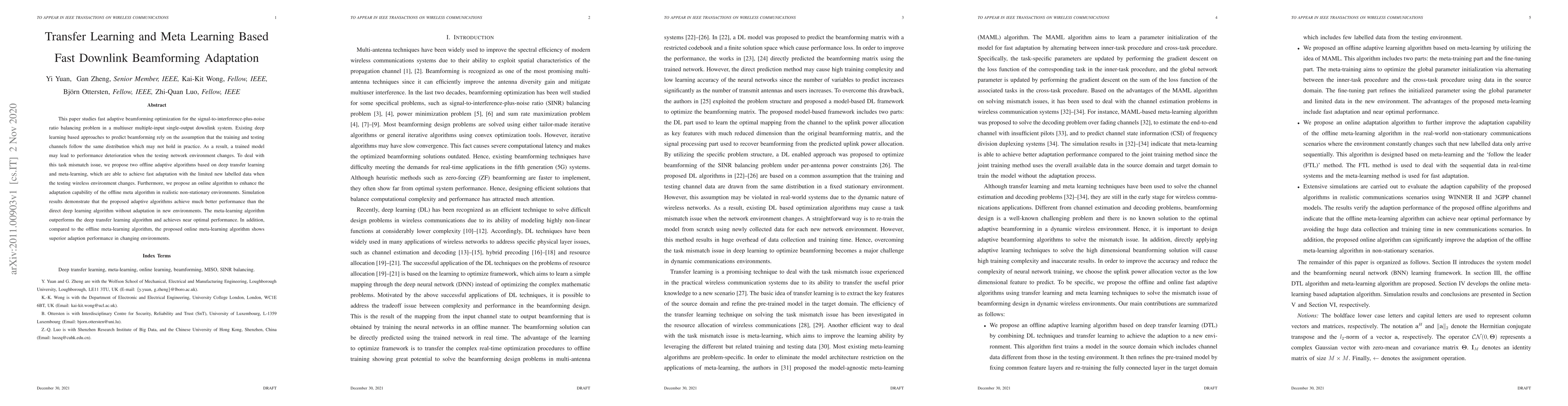 This paper proposes adaptive algorithms based on transfer learning and meta-learning to optimize beamforming in multiuser MISO systems, addressing the issue of distribution mismatch between training and testing environments. The meta-learning approach outperforms transfer learning and an online meta-learning algorithm further enhances adaptation in non-stationary conditions.