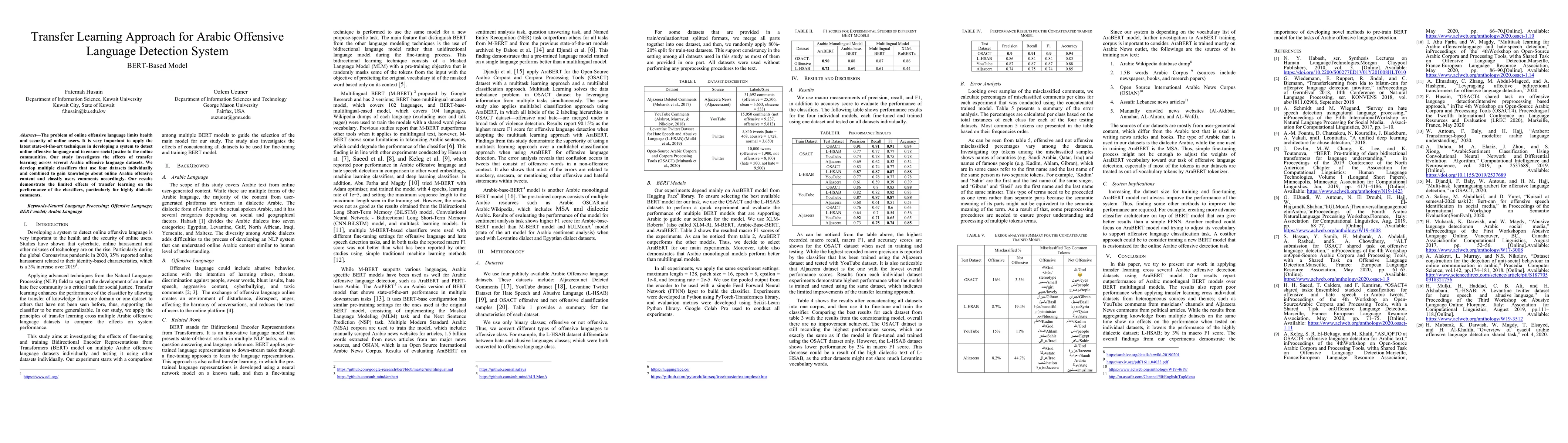 This study explores a BERT-based transfer learning approach for detecting Arabic offensive language, comparing its performance across multiple datasets. Results indicate limited transfer learning benefits, especially for highly dialectal comments.