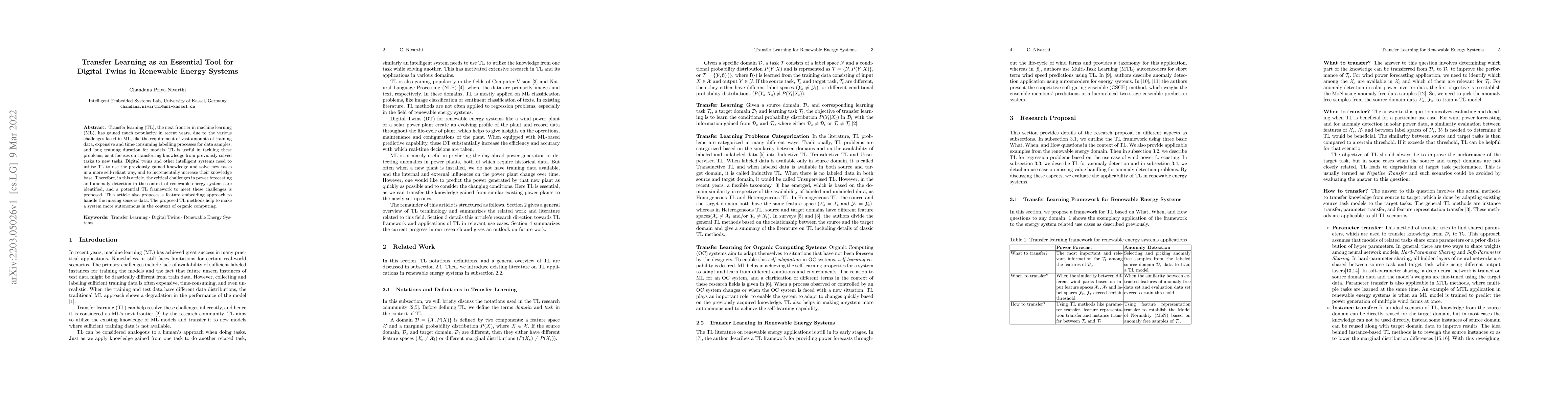 Transfer learning (TL), the next frontier in machine learning (ML), has gained much popularity in recent years, due to the various challenges faced in ML, like the requirement of vast amounts of training data, expensive and time-consuming labelling processes for data samples, and long training duration for models. TL is useful in tackling these problems, as it focuses on transferring knowledge from previously solved tasks to new tasks. Digital twins and other intelligent systems need to utilise TL to use the previously gained knowledge and solve new tasks in a more self-reliant way, and to incrementally increase their knowledge base. Therefore, in this article, the critical challenges in power forecasting and anomaly detection in the context of renewable energy systems are identified, and a potential TL framework to meet these challenges is proposed. This article also proposes a feature embedding approach to handle the missing sensors data. The proposed TL methods help to make a system more autonomous in the context of organic computing.