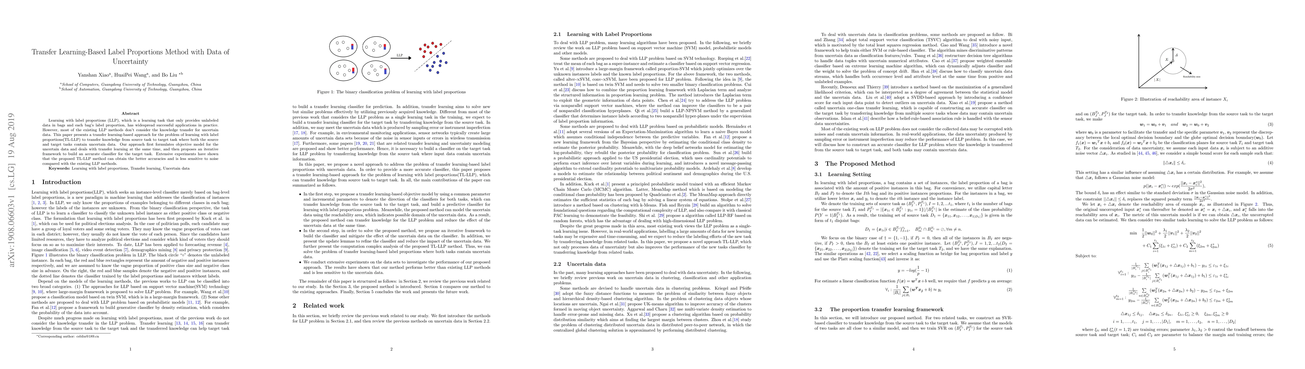 Learning with label proportions (LLP), which is a learning task that only provides unlabeled data in bags and each bag's label proportion, has widespread successful applications in practice. However, most of the existing LLP methods don't consider the knowledge transfer for uncertain data. This paper presents a transfer learning-based approach for the problem of learning with label proportions(TL-LLP) to transfer knowledge from source task to target task where both the source and target tasks contain uncertain data. Our approach first formulates objective model for the uncertain data and deals with transfer learning at the same time, and then proposes an iterative framework to build an accurate classifier for the target task. Extensive experiments have shown that the proposed TL-LLP method can obtain the better accuracies and is less sensitive to noise compared with the existing LLP methods.