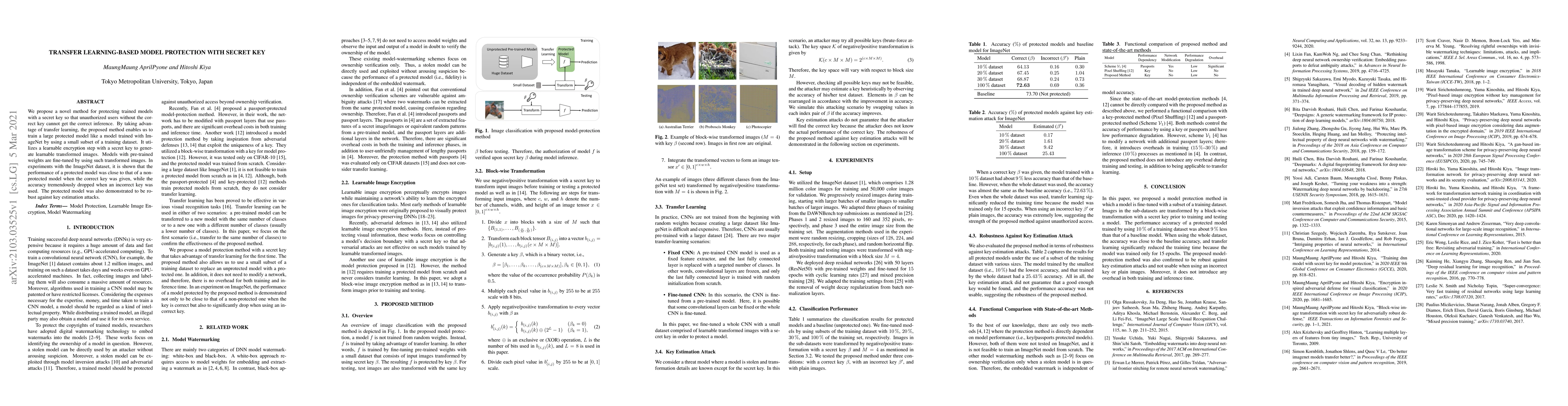Researchers propose a method to protect trained models using transfer learning and a secret key, achieving performance close to non-protected models with correct keys and robustness against key estimation attacks.