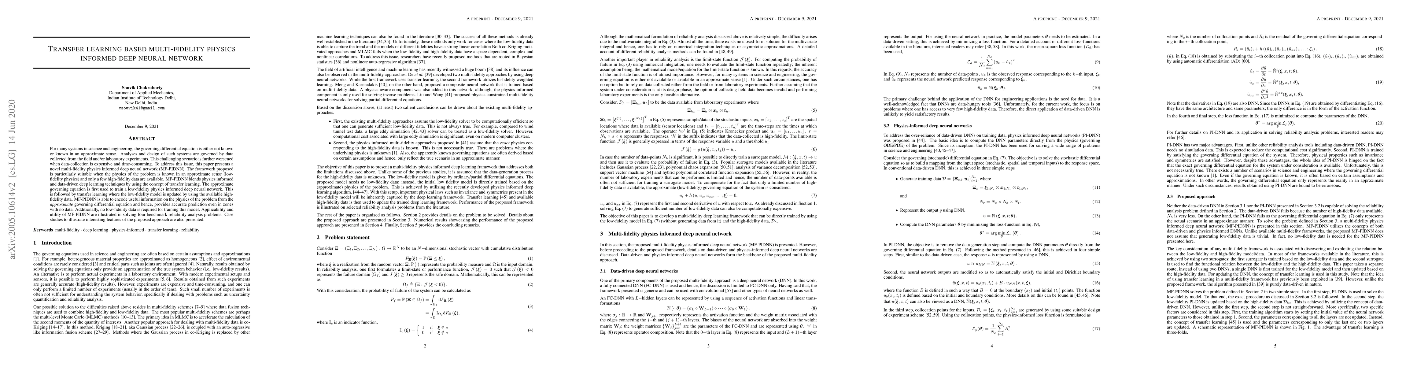 For many systems in science and engineering, the governing differential equation is either not known or known in an approximate sense. Analyses and design of such systems are governed by data collected from the field and/or laboratory experiments. This challenging scenario is further worsened when data-collection is expensive and time-consuming. To address this issue, this paper presents a novel multi-fidelity physics informed deep neural network (MF-PIDNN). The framework proposed is particularly suitable when the physics of the problem is known in an approximate sense (low-fidelity physics) and only a few high-fidelity data are available. MF-PIDNN blends physics informed and data-driven deep learning techniques by using the concept of transfer learning. The approximate governing equation is first used to train a low-fidelity physics informed deep neural network. This is followed by transfer learning where the low-fidelity model is updated by using the available high-fidelity data. MF-PIDNN is able to encode useful information on the physics of the problem from the {\it approximate} governing differential equation and hence, provides accurate prediction even in zones with no data. Additionally, no low-fidelity data is required for training this model. Applicability and utility of MF-PIDNN are illustrated in solving four benchmark reliability analysis problems. Case studies to illustrate interesting features of the proposed approach are also presented.