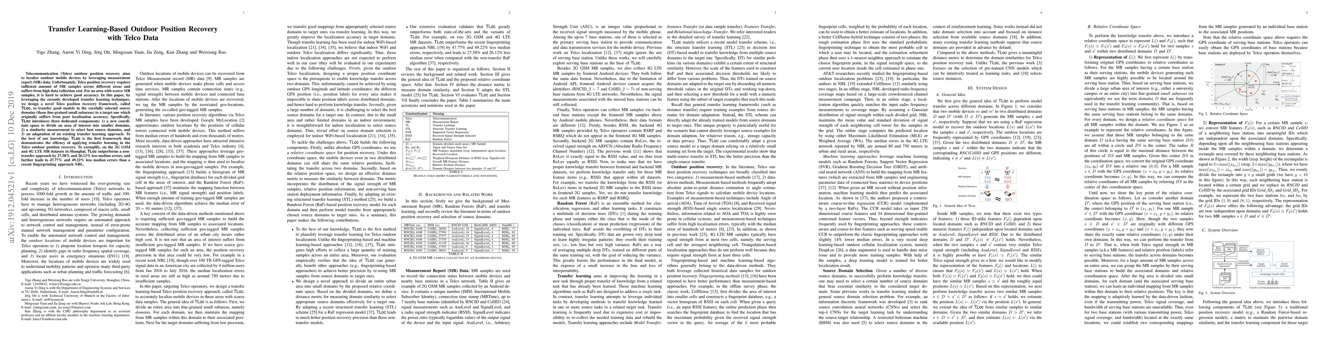 Telecommunication (Telco) outdoor position recovery aims to localize outdoor mobile devices by leveraging measurement report (MR) data. Unfortunately, Telco position recovery requires sufficient amount of MR samples across different areas and suffers from high data collection cost. For an area with scarce MR samples, it is hard to achieve good accuracy. In this paper, by leveraging the recently developed transfer learning techniques, we design a novel Telco position recovery framework, called TLoc, to transfer good models in the carefully selected source domains (those fine-grained small subareas) to a target one which originally suffers from poor localization accuracy. Specifically, TLoc introduces three dedicated components: 1) a new coordinate space to divide an area of interest into smaller domains, 2) a similarity measurement to select best source domains, and 3) an adaptation of an existing transfer learning approach. To the best of our knowledge, TLoc is the first framework that demonstrates the efficacy of applying transfer learning in the Telco outdoor position recovery. To exemplify, on the 2G GSM and 4G LTE MR datasets in Shanghai, TLoc outperforms a nontransfer approach by 27.58% and 26.12% less median errors, and further leads to 47.77% and 49.22% less median errors than a recent fingerprinting approach NBL.