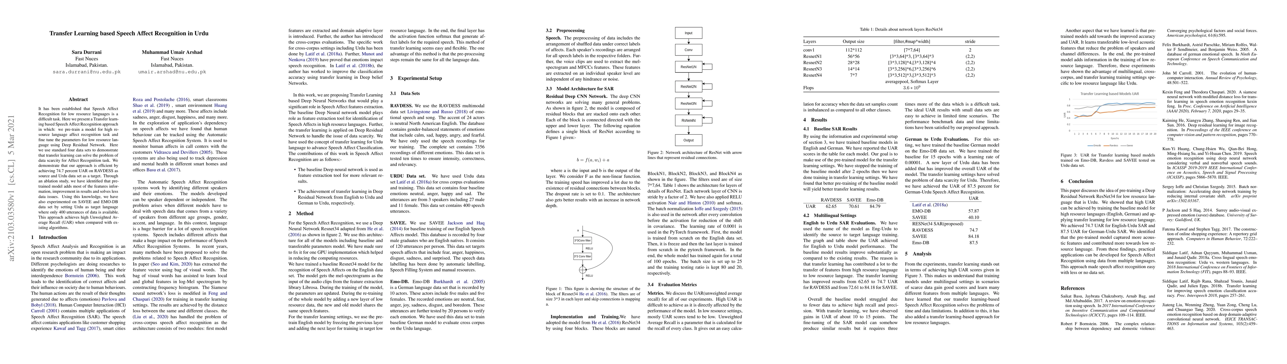 It has been established that Speech Affect Recognition for low resource languages is a difficult task. Here we present a Transfer learning based Speech Affect Recognition approach in which: we pre-train a model for high resource language affect recognition task and fine tune the parameters for low resource language using Deep Residual Network. Here we use standard four data sets to demonstrate that transfer learning can solve the problem of data scarcity for Affect Recognition task. We demonstrate that our approach is efficient by achieving 74.7 percent UAR on RAVDESS as source and Urdu data set as a target. Through an ablation study, we have identified that pre-trained model adds most of the features information, improvement in results and solves less data issues. Using this knowledge, we have also experimented on SAVEE and EMO-DB data set by setting Urdu as target language where only 400 utterances of data is available. This approach achieves high Unweighted Average Recall (UAR) when compared with existing algorithms.