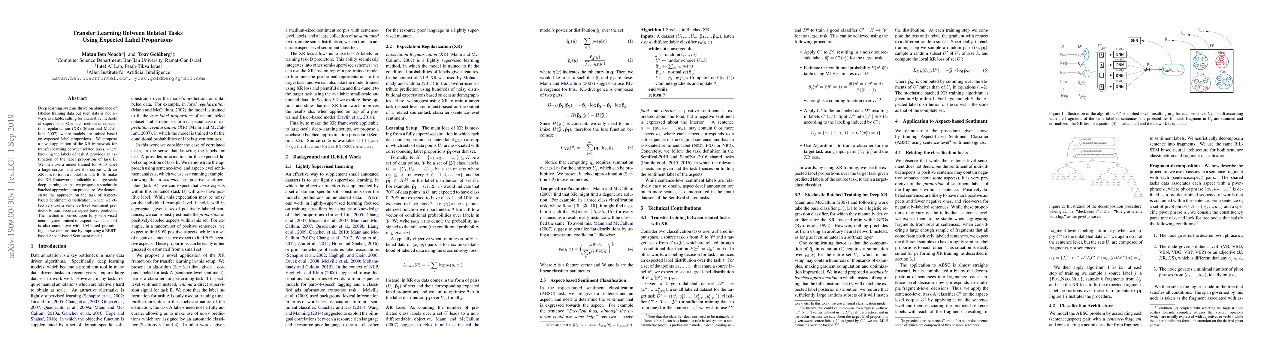 This research introduces a novel application of expectation regularization (XR) for transfer learning between related tasks using expected label proportions. The method, validated on Aspect-based Sentiment classification, demonstrates improved performance over fully supervised neural systems and is cumulative with language model-based pretraining.