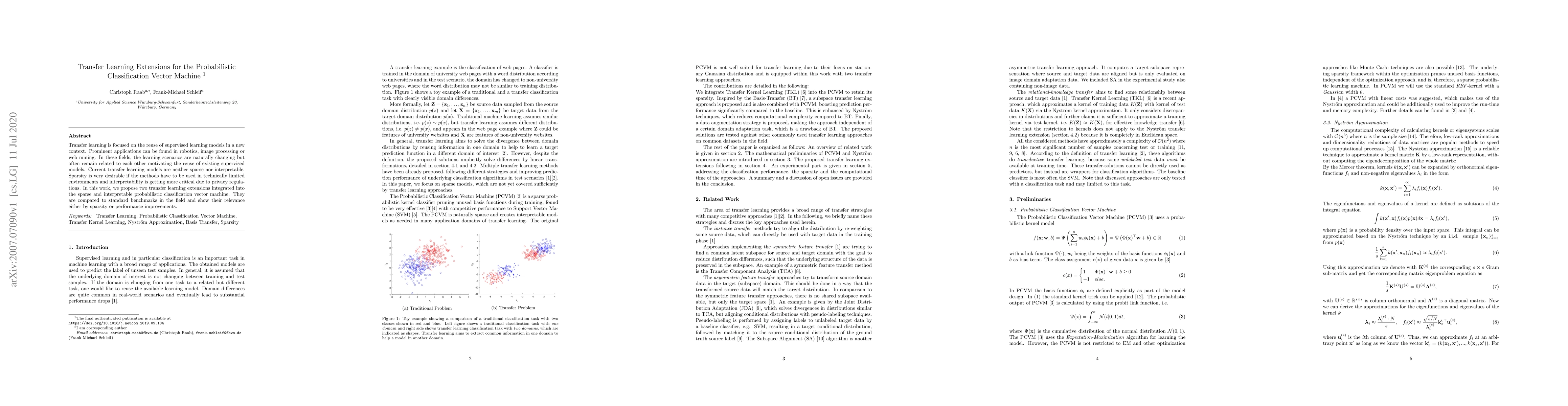 This paper proposes two transfer learning extensions for the probabilistic classification vector machine, improving sparsity and interpretability in limited environments.