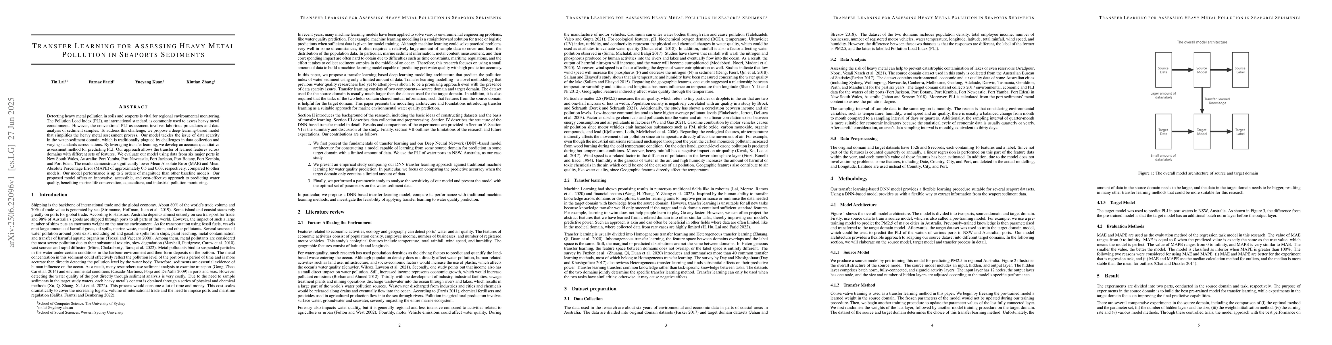 Detecting heavy metal pollution in soils and seaports is vital for regional environmental monitoring. The Pollution Load Index (PLI), an international standard, is commonly used to assess heavy metal containment. However, the conventional PLI assessment involves laborious procedures and data analysis of sediment samples. To address this challenge, we propose a deep-learning-based model that simplifies the heavy metal assessment process. Our model tackles the issue of data scarcity in the water-sediment domain, which is traditionally plagued by challenges in data collection and varying standards across nations. By leveraging transfer learning, we develop an accurate quantitative assessment method for predicting PLI. Our approach allows the transfer of learned features across domains with different sets of features. We evaluate our model using data from six major ports in New South Wales, Australia: Port Yamba, Port Newcastle, Port Jackson, Port Botany, Port Kembla, and Port Eden. The results demonstrate significantly lower Mean Absolute Error (MAE) and Mean Absolute Percentage Error (MAPE) of approximately 0.5 and 0.03, respectively, compared to other models. Our model performance is up to 2 orders of magnitude than other baseline models. Our proposed model offers an innovative, accessible, and cost-effective approach to predicting water quality, benefiting marine life conservation, aquaculture, and industrial pollution monitoring.
