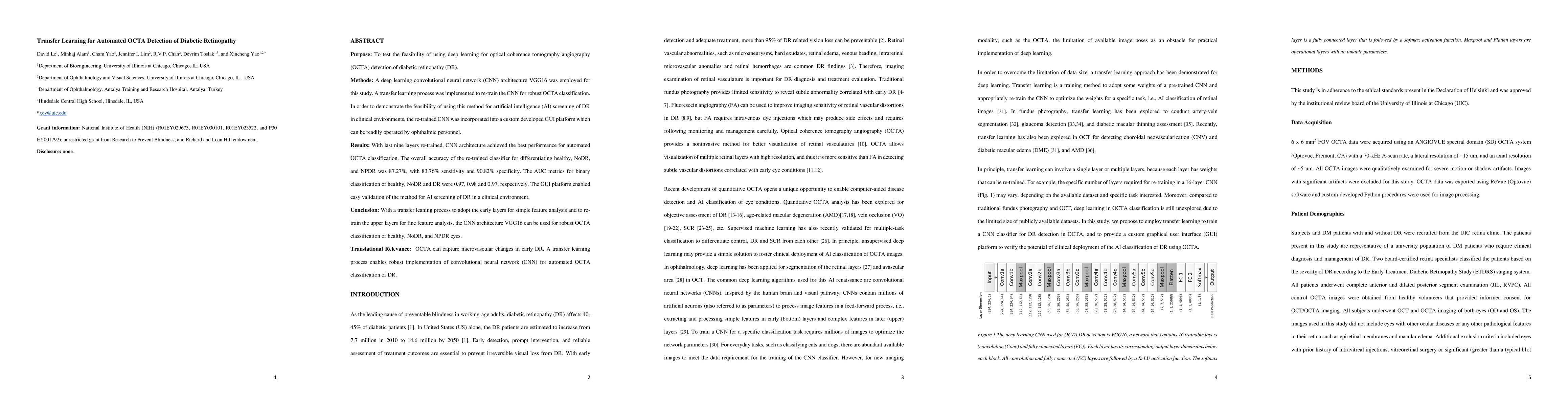This study demonstrates the use of a deep learning convolutional neural network (CNN) architecture VGG16 with transfer learning for automated OCTA detection of diabetic retinopathy, achieving an 87.27% overall accuracy. The method is implemented in a GUI platform for easy clinical use, showing potential for AI screening in ophthalmic care.