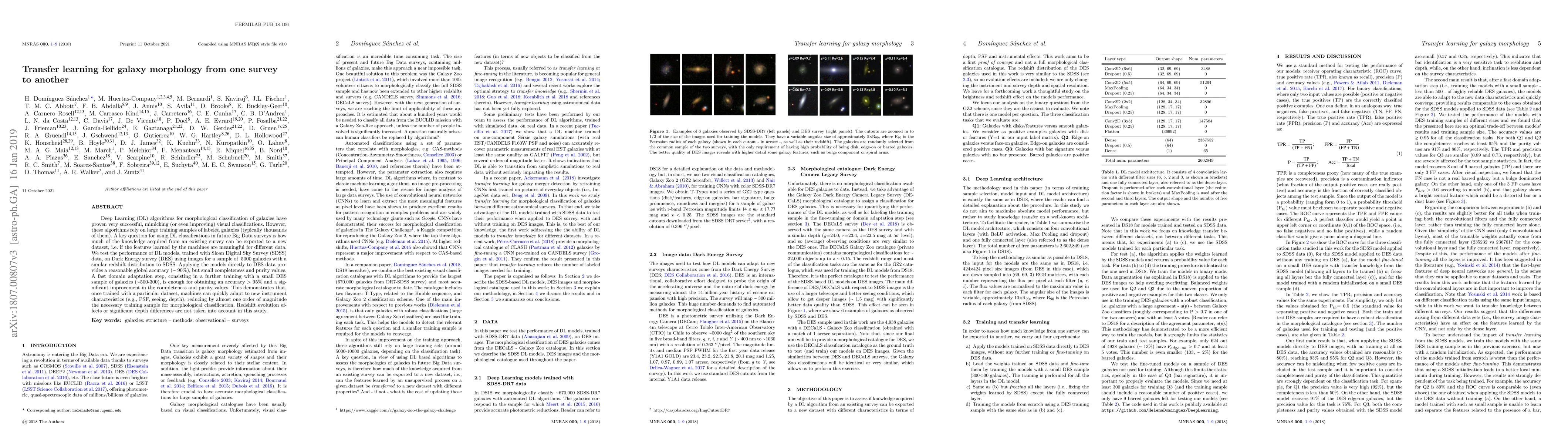 Deep Learning (DL) algorithms for morphological classification of galaxies have proven very successful, mimicking (or even improving) visual classifications. However, these algorithms rely on large training samples of labelled galaxies (typically thousands of them). A key question for using DL classifications in future Big Data surveys is how much of the knowledge acquired from an existing survey can be exported to a new dataset, i.e. if the features learned by the machines are meaningful for different data. We test the performance of DL models, trained with Sloan Digital Sky Survey (SDSS) data, on Dark Energy survey (DES) using images for a sample of $\sim$5000 galaxies with a similar redshift distribution to SDSS. Applying the models directly to DES data provides a reasonable global accuracy ($\sim$ 90%), but small completeness and purity values. A fast domain adaptation step, consisting in a further training with a small DES sample of galaxies ($\sim$500-300), is enough for obtaining an accuracy > 95% and a significant improvement in the completeness and purity values. This demonstrates that, once trained with a particular dataset, machines can quickly adapt to new instrument characteristics (e.g., PSF, seeing, depth), reducing by almost one order of magnitude the necessary training sample for morphological classification. Redshift evolution effects or significant depth differences are not taken into account in this study.