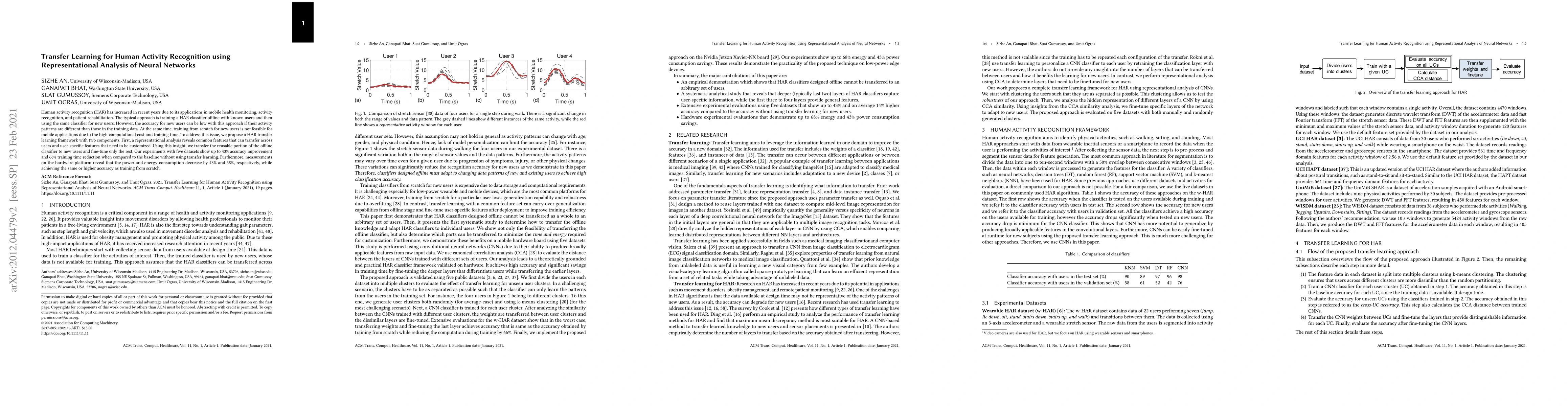 This paper proposes a transfer learning framework for human activity recognition (HAR) to improve accuracy for new users and reduce computational costs. The framework transfers common features across users and fine-tunes user-specific features, achieving up to 43% accuracy improvement and 66% training time reduction compared to traditional methods.