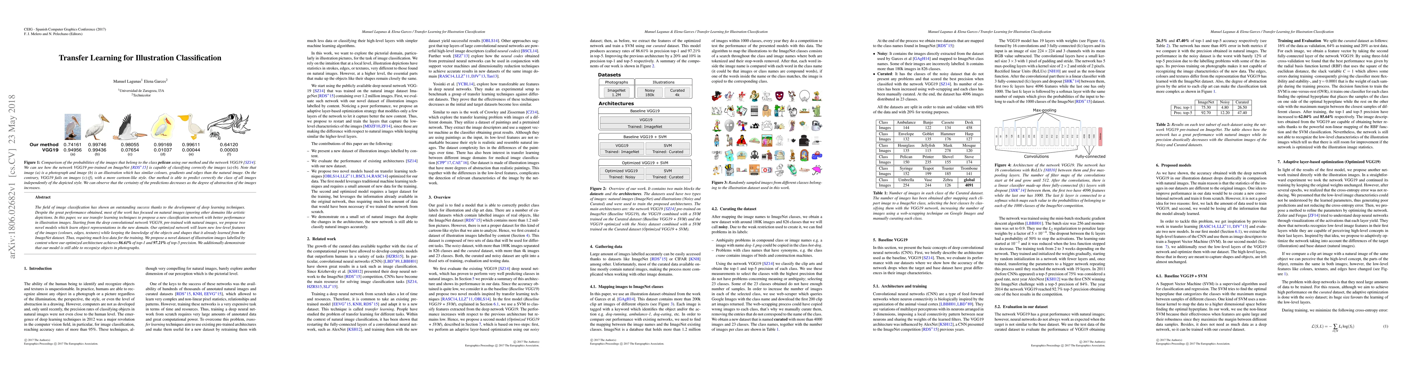 The field of image classification has shown an outstanding success thanks to the development of deep learning techniques. Despite the great performance obtained, most of the work has focused on natural images ignoring other domains like artistic depictions. In this paper, we use transfer learning techniques to propose a new classification network with better performance in illustration images. Starting from the deep convolutional network VGG19, pre-trained with natural images, we propose two novel models which learn object representations in the new domain. Our optimized network will learn new low-level features of the images (colours, edges, textures) while keeping the knowledge of the objects and shapes that it already learned from the ImageNet dataset. Thus, requiring much less data for the training. We propose a novel dataset of illustration images labelled by content where our optimized architecture achieves $\textbf{86.61\%}$ of top-1 and $\textbf{97.21\%}$ of top-5 precision. We additionally demonstrate that our model is still able to recognize objects in photographs.