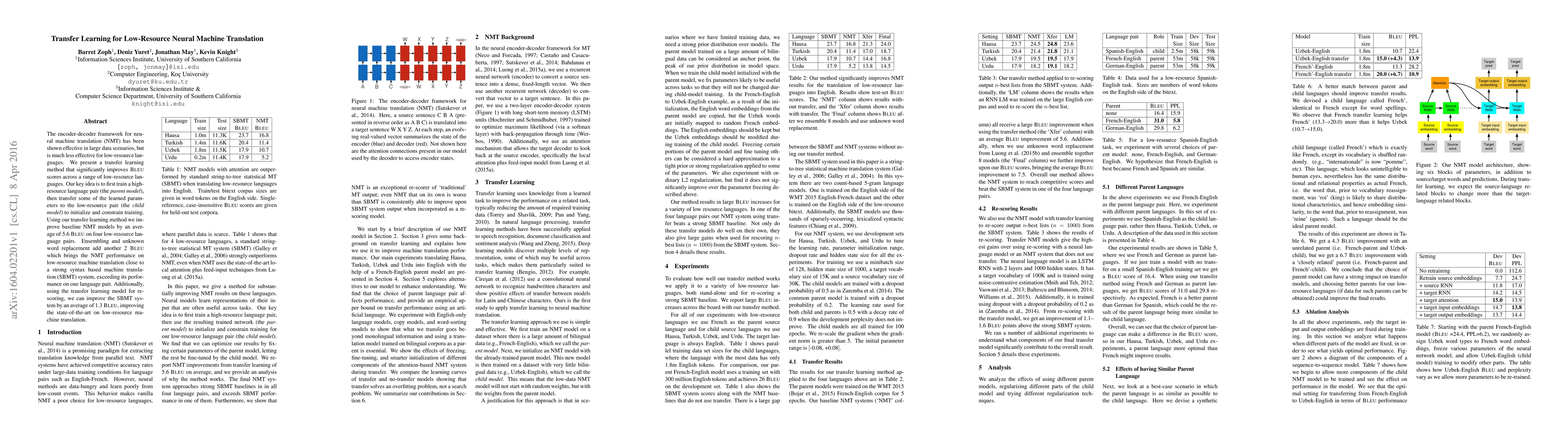 This research introduces a transfer learning method to enhance neural machine translation (NMT) for low-resource languages, achieving an average 5.6 Bleu score improvement. It leverages a high-resource language pair to initialize and constrain training for low-resource pairs, with further enhancements through ensembling and unknown word replacement, closing the performance gap with syntax-based systems.
