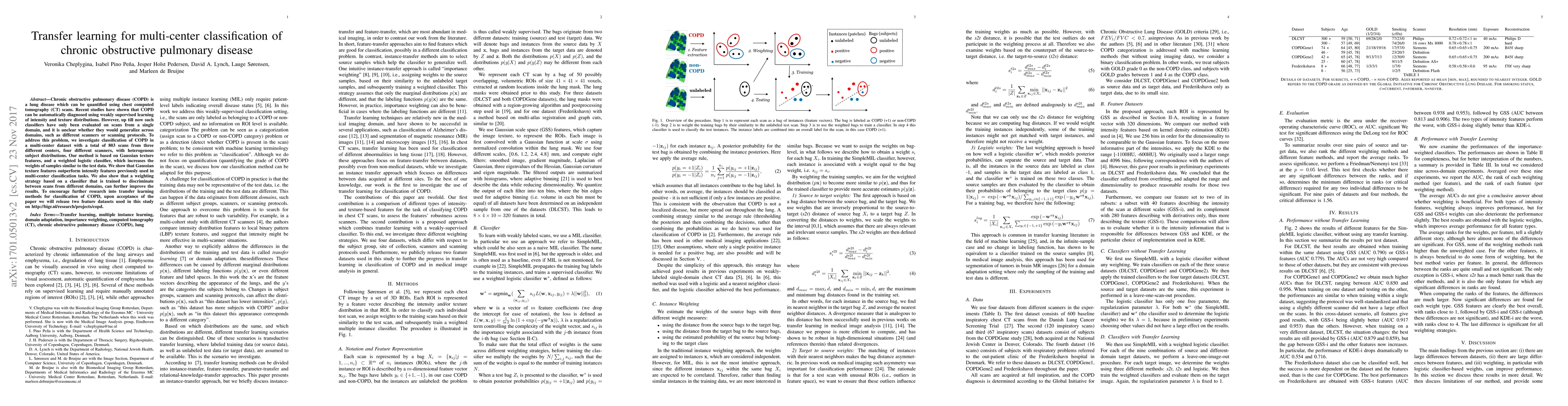 This paper explores the use of transfer learning for classifying COPD across multiple centers using chest CT scans. The study demonstrates that Gaussian texture features are more effective than intensity features and that a weighting strategy based on domain discrimination further enhances classification performance.