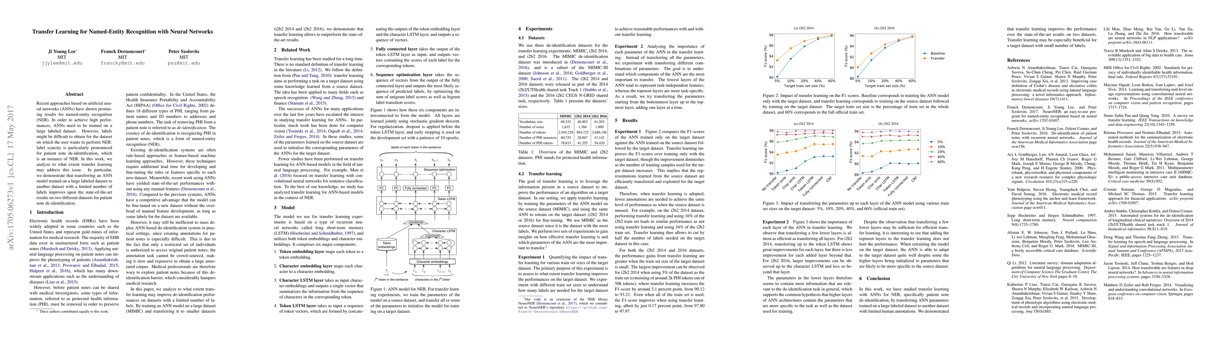 This paper explores the use of transfer learning with neural networks to improve named-entity recognition (NER) performance, especially in scenarios where labeled data is scarce, such as patient note de-identification. The study shows that transferring a pre-trained model to a new dataset with limited labels significantly outperforms state-of-the-art methods.