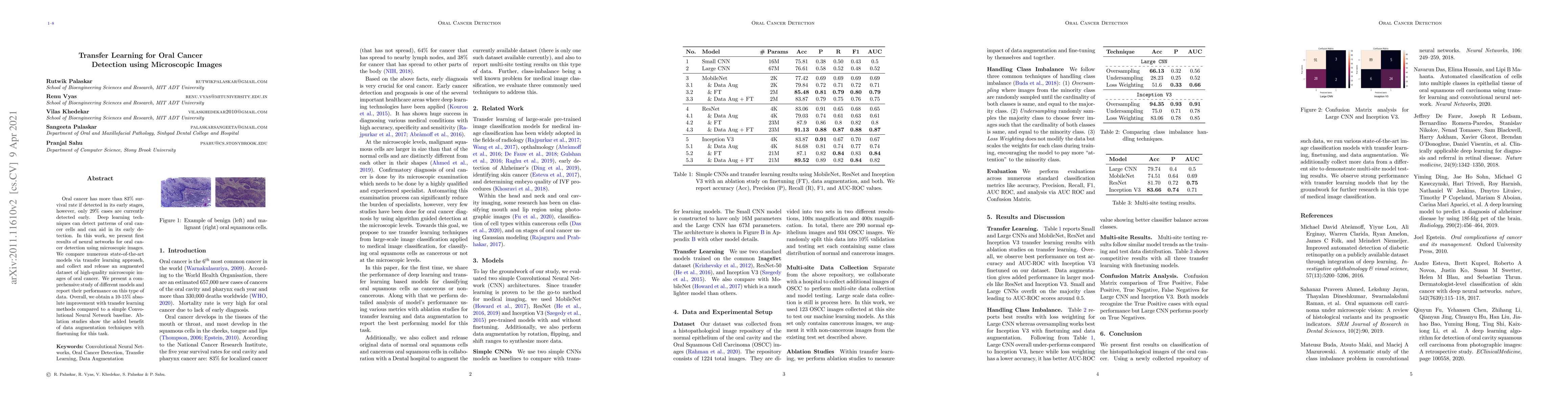 This paper explores the use of transfer learning for detecting oral cancer from microscopic images, achieving a 10-15% improvement over baseline models. The study compares various state-of-the-art neural networks and releases an augmented dataset, highlighting the benefits of data augmentation and finetuning.
