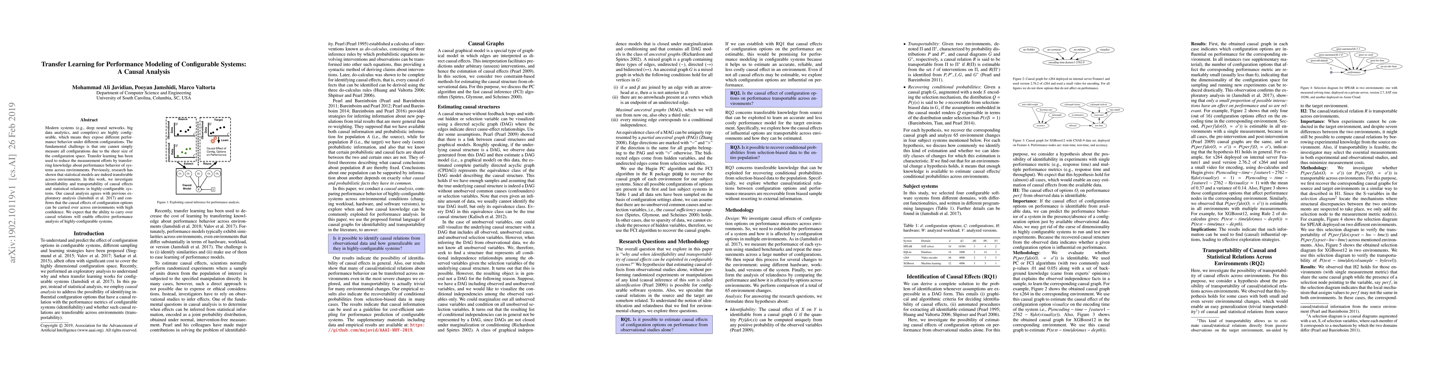 Modern systems (e.g., deep neural networks, big data analytics, and compilers) are highly configurable, which means they expose different performance behavior under different configurations. The fundamental challenge is that one cannot simply measure all configurations due to the sheer size of the configuration space. Transfer learning has been used to reduce the measurement efforts by transferring knowledge about performance behavior of systems across environments. Previously, research has shown that statistical models are indeed transferable across environments. In this work, we investigate identifiability and transportability of causal effects and statistical relations in highly-configurable systems. Our causal analysis agrees with previous exploratory analysis \cite{Jamshidi17} and confirms that the causal effects of configuration options can be carried over across environments with high confidence. We expect that the ability to carry over causal relations will enable effective performance analysis of highly-configurable systems.