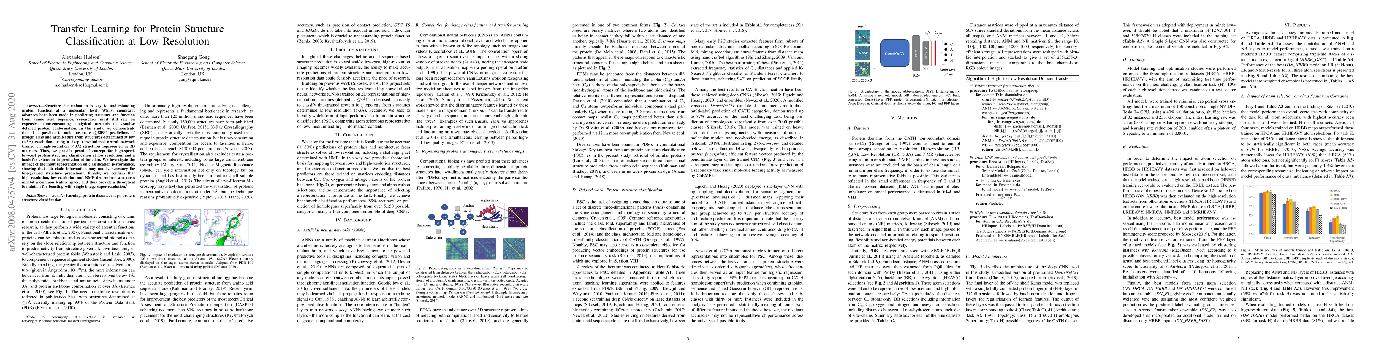 Structure determination is key to understanding protein function at a molecular level. Whilst significant advances have been made in predicting structure and function from amino acid sequence, researchers must still rely on expensive, time-consuming analytical methods to visualise detailed protein conformation. In this study, we demonstrate that it is possible to make accurate ($\geq$80%) predictions of protein class and architecture from structures determined at low ($>$3A) resolution, using a deep convolutional neural network trained on high-resolution ($\leq$3A) structures represented as 2D matrices. Thus, we provide proof of concept for high-speed, low-cost protein structure classification at low resolution, and a basis for extension to prediction of function. We investigate the impact of the input representation on classification performance, showing that side-chain information may not be necessary for fine-grained structure predictions. Finally, we confirm that high-resolution, low-resolution and NMR-determined structures inhabit a common feature space, and thus provide a theoretical foundation for boosting with single-image super-resolution.