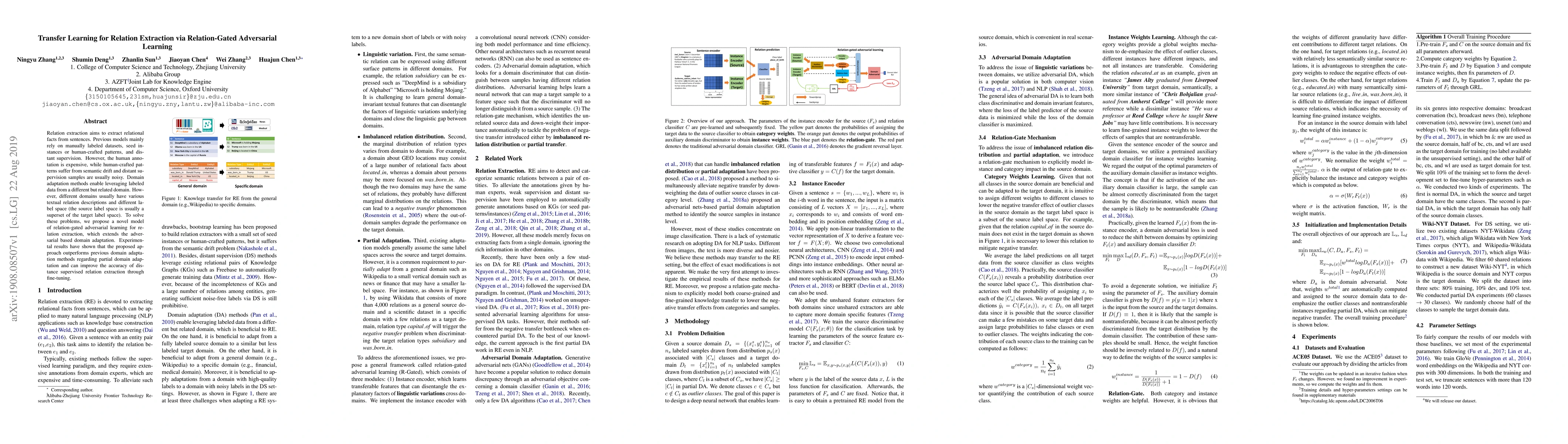 This paper proposes a novel relation-gated adversarial learning model for relation extraction, addressing the challenges of expensive human annotation, semantic drift, and noisy distant supervision. The model extends adversarial-based domain adaptation to improve accuracy in partial domain adaptation and enhance distance supervised relation extraction.