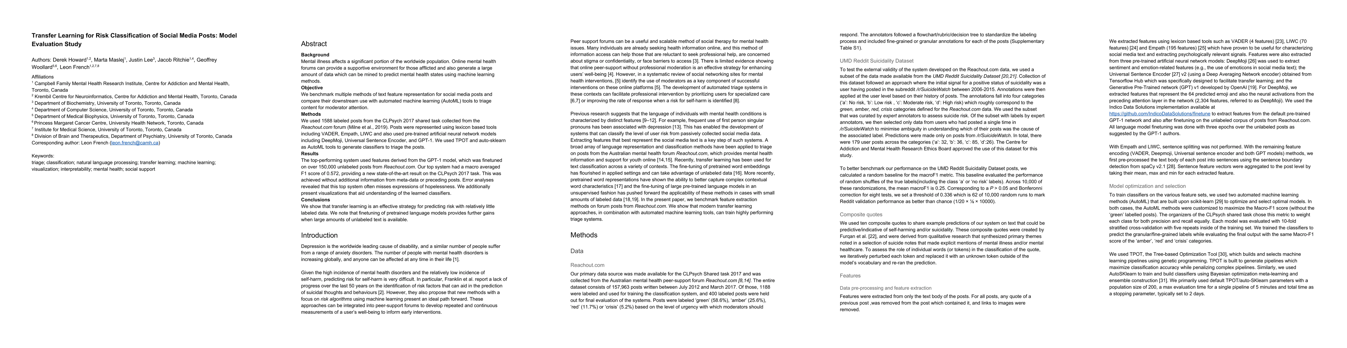 Mental illness affects a significant portion of the worldwide population. Online mental health forums can provide a supportive environment for those afflicted and also generate a large amount of data which can be mined to predict mental health states using machine learning methods. We benchmark multiple methods of text feature representation for social media posts and compare their downstream use with automated machine learning (AutoML) tools to triage content for moderator attention. We used 1588 labeled posts from the CLPsych 2017 shared task collected from the Reachout.com forum (Milne et al., 2019). Posts were represented using lexicon based tools including VADER, Empath, LIWC and also used pre-trained artificial neural network models including DeepMoji, Universal Sentence Encoder, and GPT-1. We used TPOT and auto-sklearn as AutoML tools to generate classifiers to triage the posts. The top-performing system used features derived from the GPT-1 model, which was finetuned on over 150,000 unlabeled posts from Reachout.com. Our top system had a macro averaged F1 score of 0.572, providing a new state-of-the-art result on the CLPsych 2017 task. This was achieved without additional information from meta-data or preceding posts. Error analyses revealed that this top system often misses expressions of hopelessness. We additionally present visualizations that aid understanding of the learned classifiers. We show that transfer learning is an effective strategy for predicting risk with relatively little labeled data. We note that finetuning of pretrained language models provides further gains when large amounts of unlabeled text is available.