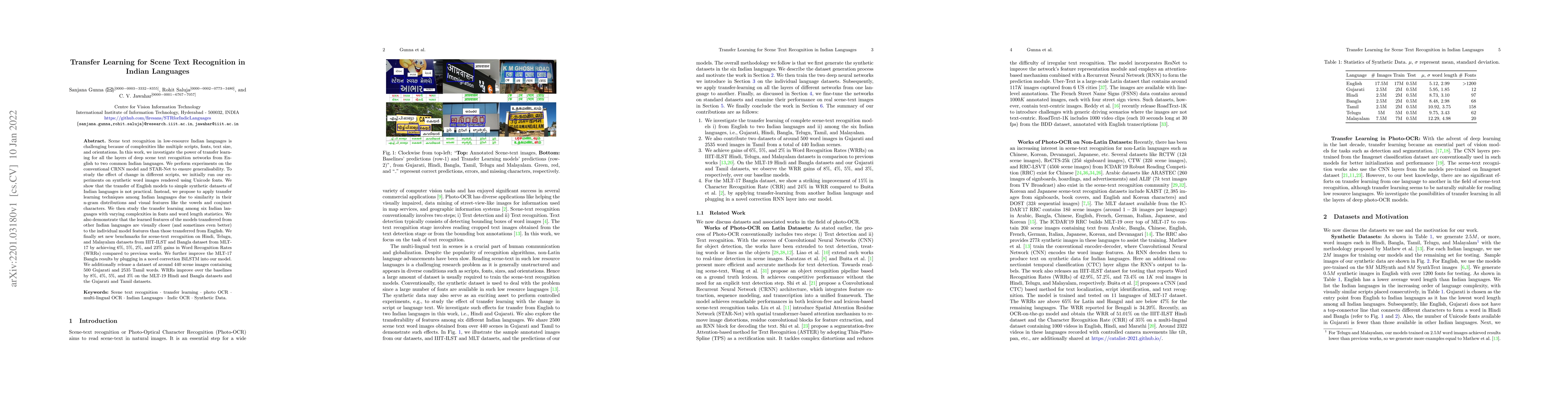 This paper explores transfer learning for scene text recognition in low-resource Indian languages, demonstrating that direct transfer from English models is ineffective. Instead, it proposes transfer learning among Indian languages, achieving better results and setting new benchmarks for Hindi, Telugu, Malayalam, and Bangla, with notable improvements in Word Recognition Rates.