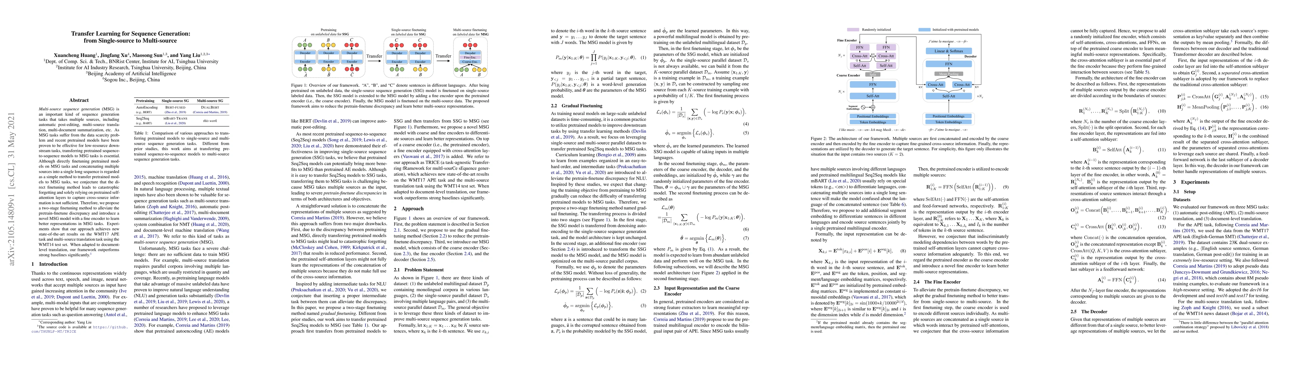 Multi-source sequence generation (MSG) is an important kind of sequence generation tasks that takes multiple sources, including automatic post-editing, multi-source translation, multi-document summarization, etc. As MSG tasks suffer from the data scarcity problem and recent pretrained models have been proven to be effective for low-resource downstream tasks, transferring pretrained sequence-to-sequence models to MSG tasks is essential. Although directly finetuning pretrained models on MSG tasks and concatenating multiple sources into a single long sequence is regarded as a simple method to transfer pretrained models to MSG tasks, we conjecture that the direct finetuning method leads to catastrophic forgetting and solely relying on pretrained self-attention layers to capture cross-source information is not sufficient. Therefore, we propose a two-stage finetuning method to alleviate the pretrain-finetune discrepancy and introduce a novel MSG model with a fine encoder to learn better representations in MSG tasks. Experiments show that our approach achieves new state-of-the-art results on the WMT17 APE task and multi-source translation task using the WMT14 test set. When adapted to document-level translation, our framework outperforms strong baselines significantly.